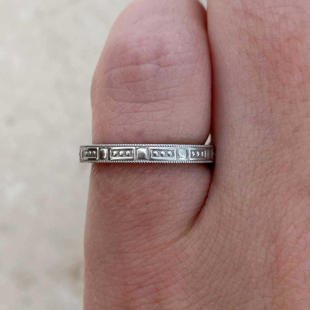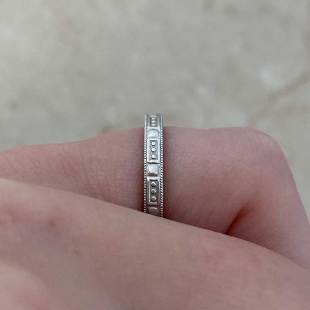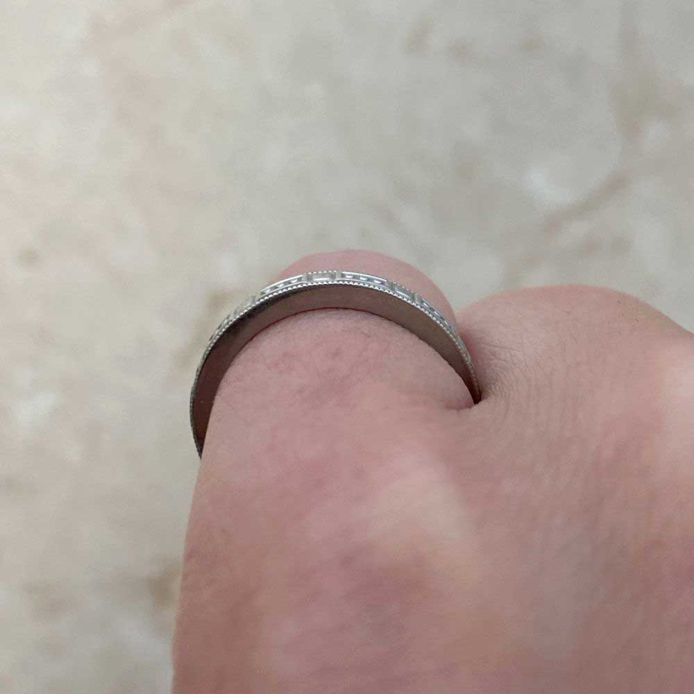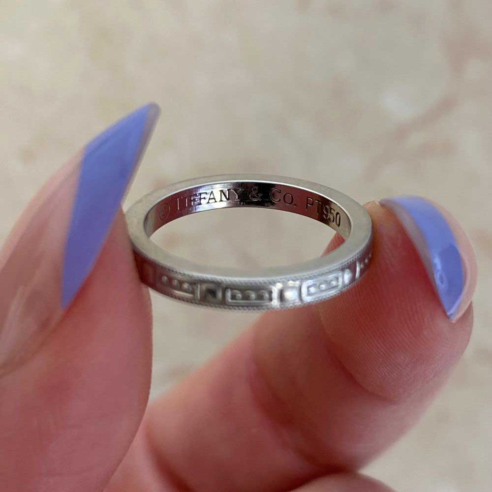 A Tiffany wedding band featuring a geometric engraved pattern with milgrain detailing. This band was handcrafted in platinum and signed Tiffany & Co.