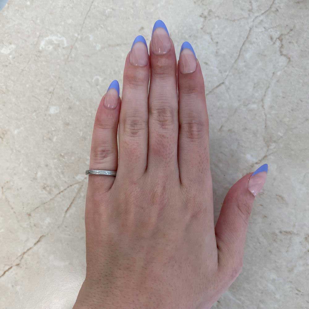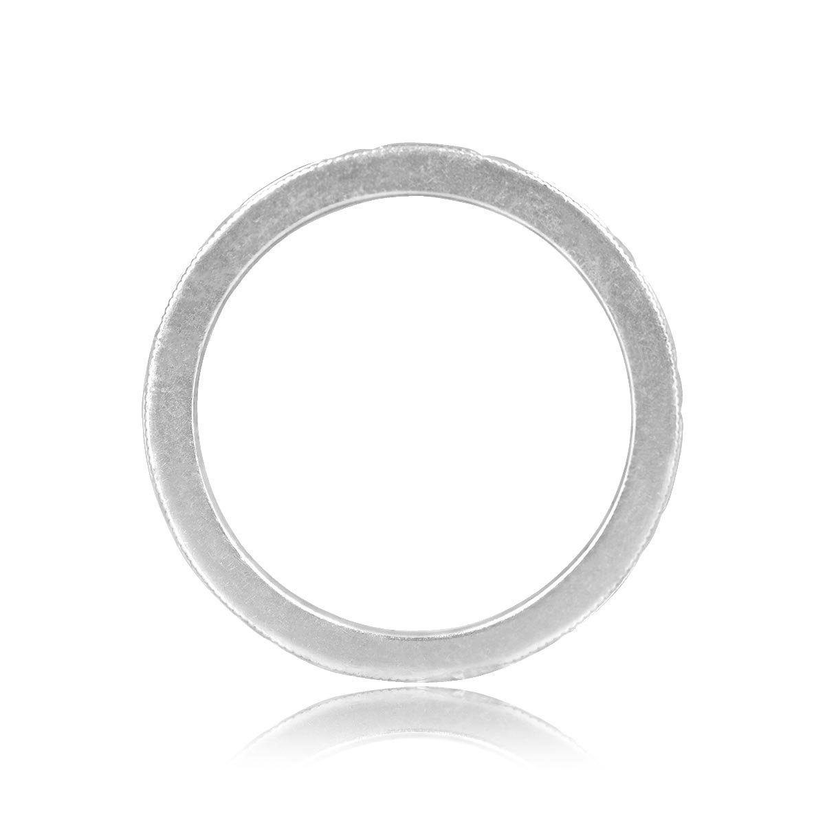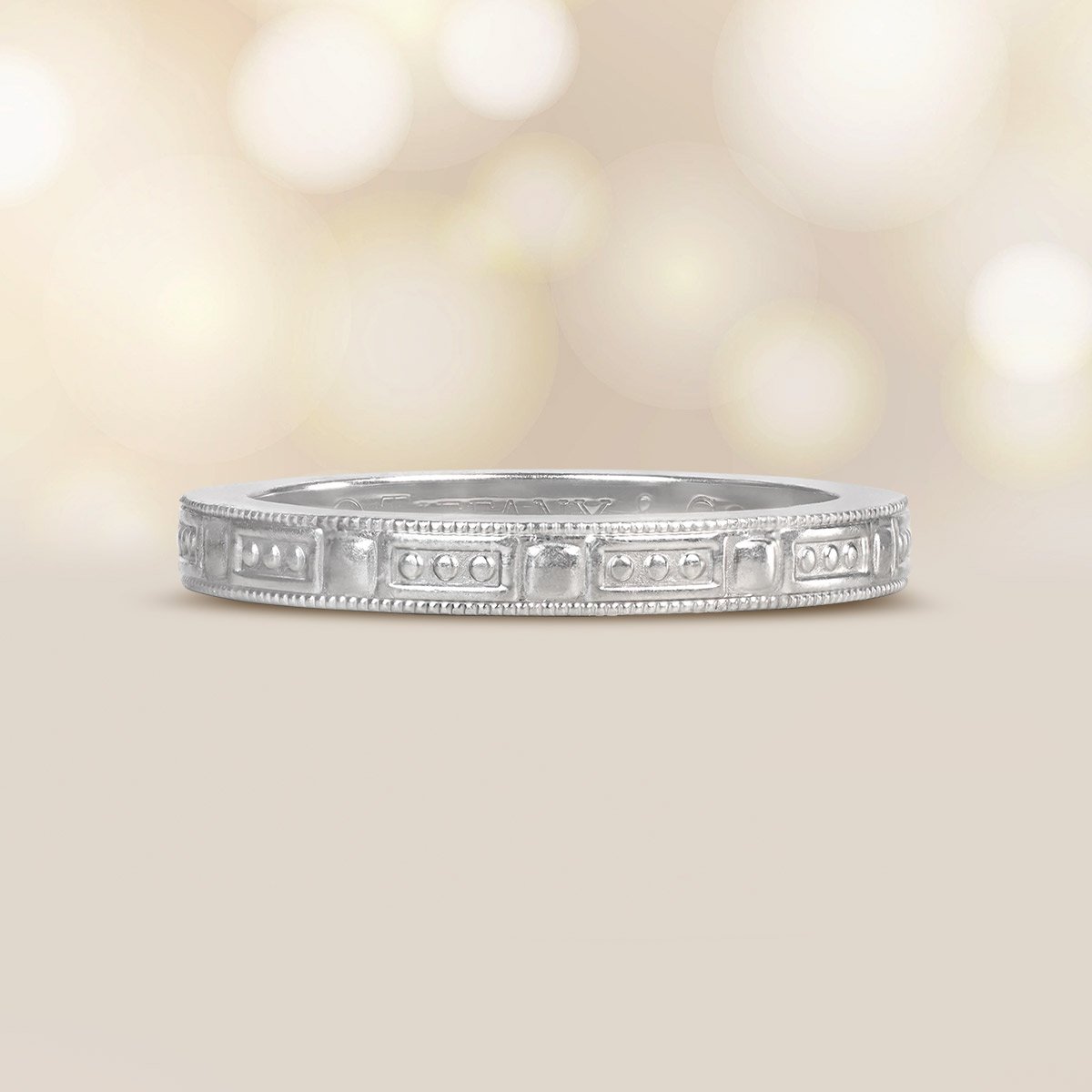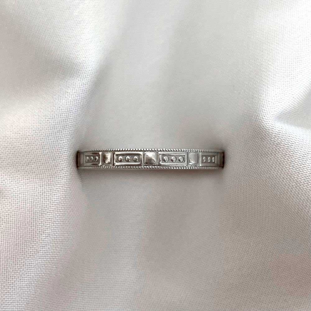 A Tiffany wedding band featuring a geometric engraved pattern with milgrain detailing. This band was handcrafted in platinum and signed Tiffany & Co.