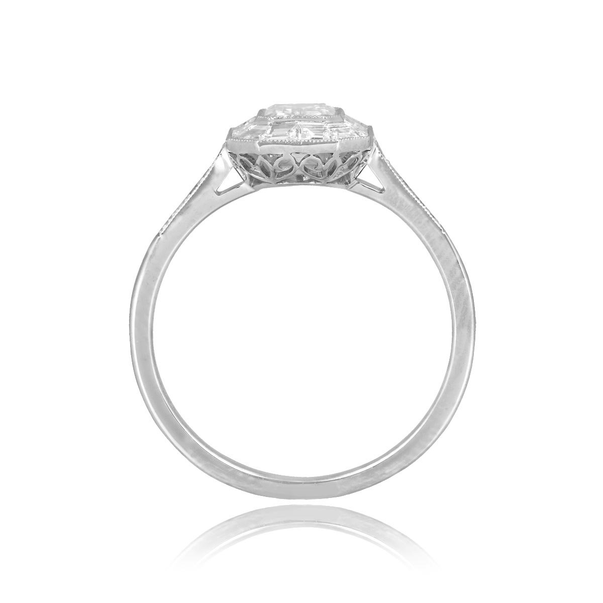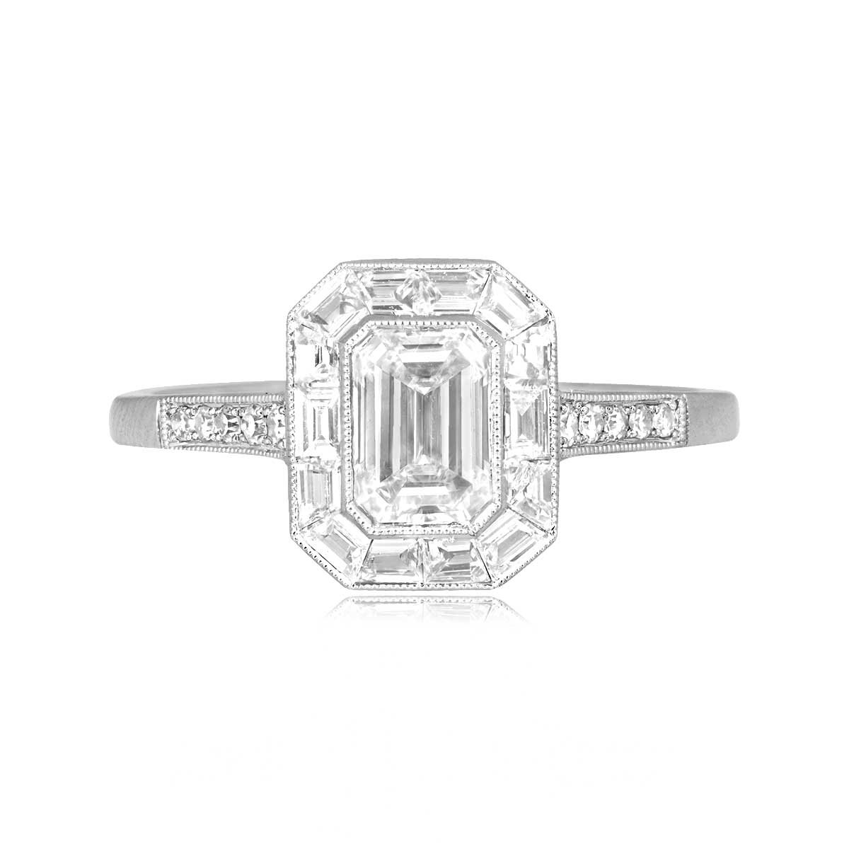 A stunning ring featuring emerald-cut center diamond that is bezel-set and certified by GIA as 0.80 carats, H color, and VS2 clarity. Surrounding the center diamond is a halo of baguette-cut diamonds that weigh 0.38 carats. Lining the shoulders are additional round brilliant cut diamonds weighing approximately 0.08 carats. Fine milgrain and an openwork under-gallery further enhance the beauty of the ring. This ring is mounted in platinum.