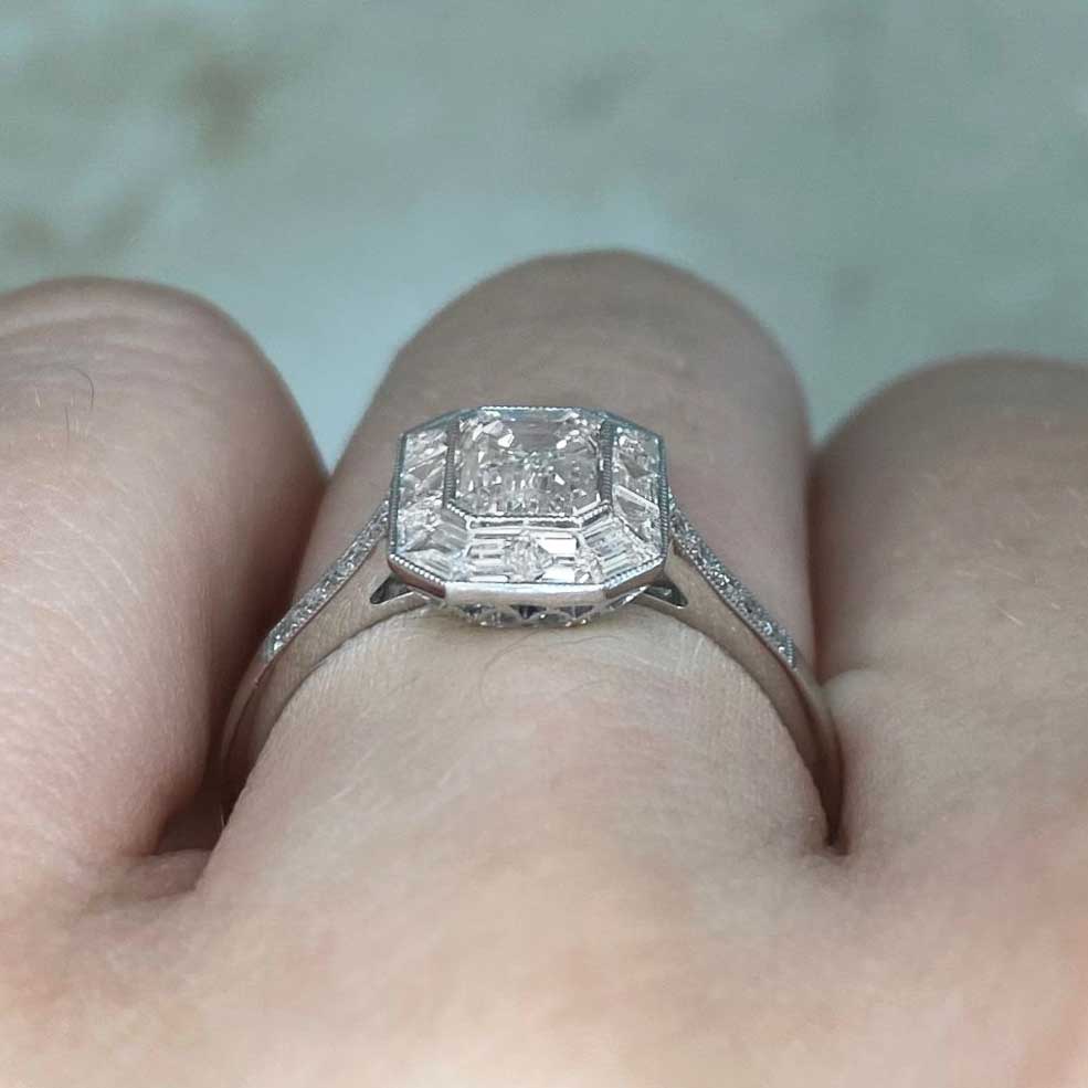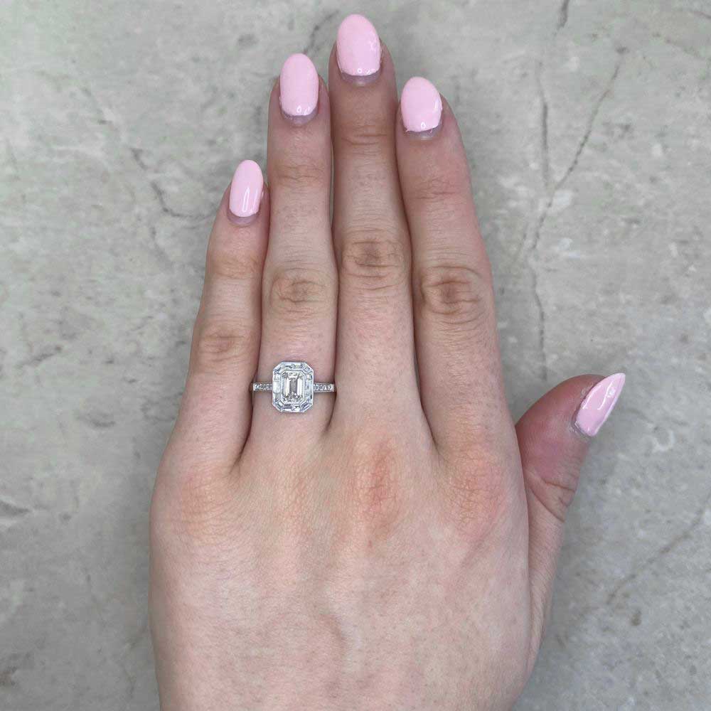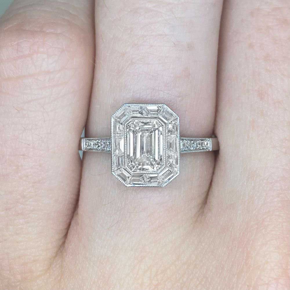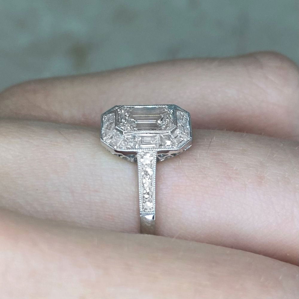 A Word from the Jeweler: The combination of an emerald-cut center diamond with a baguette halo gives this ring a crisp, geometric look. I love how it pairs with other vintage jewelry, making it a versatile addition to any collection.