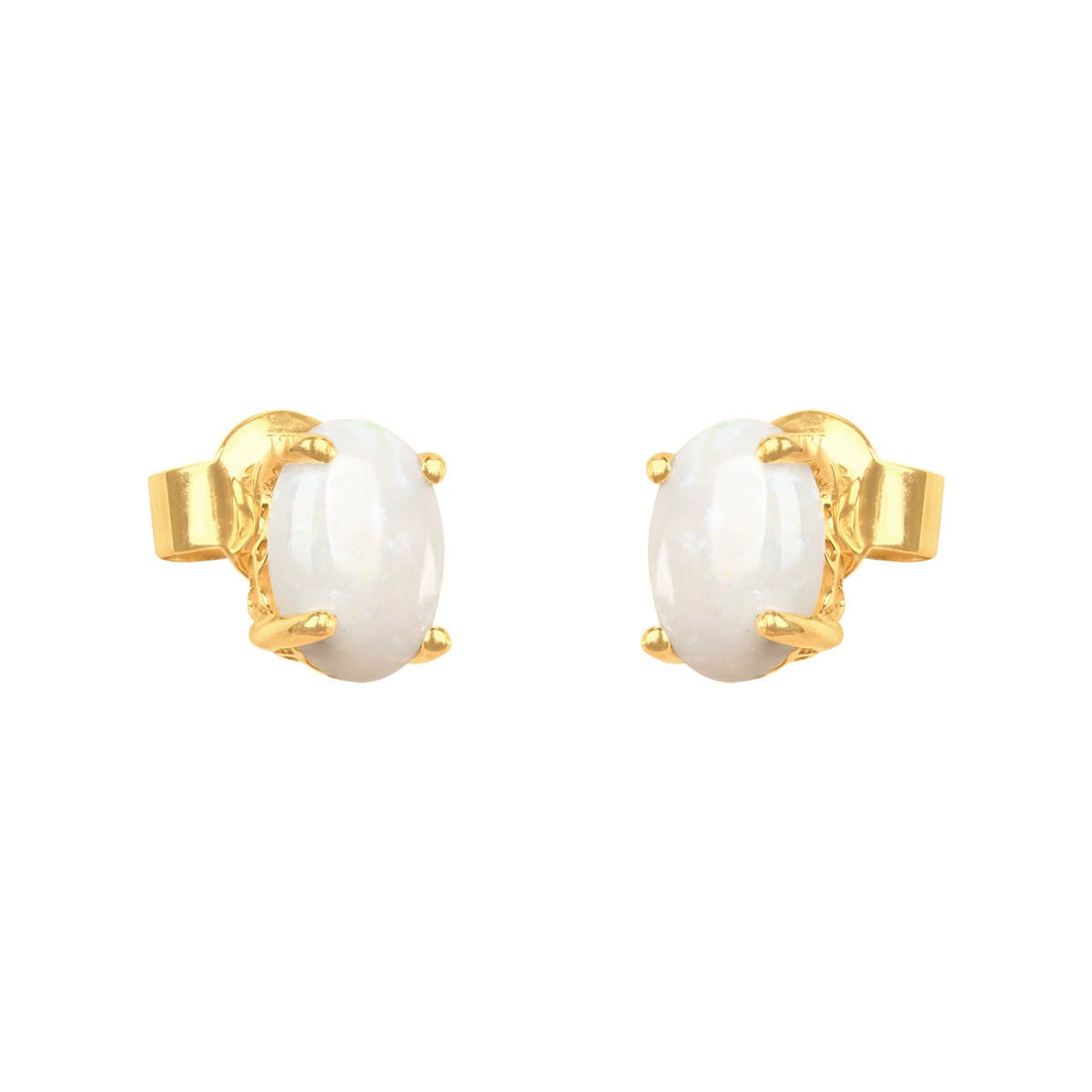 This pair of earrings feature oval cut opal stones set in a prong setting weighing a total of 0.77 carats. Openwork detailing decorated the mounting of these stud earrings. These earrings were made in 14k yellow gold.
