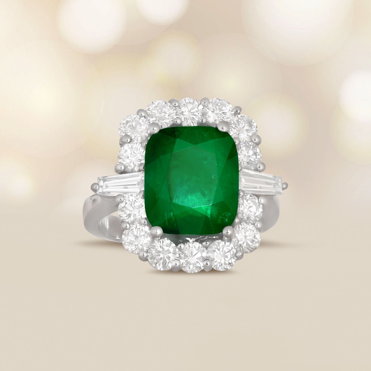 A bold ring featuring a 3.36ct cushion-cut natural Colombian emerald center that is prong-set. Surrounding the emerald is a halo of pave-set round brilliant cut diamonds. Two tapered baguette-cut diamonds flank the center stone. The total weight of the diamonds is approximately 1.70 carats.