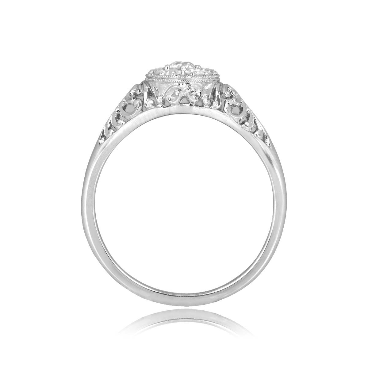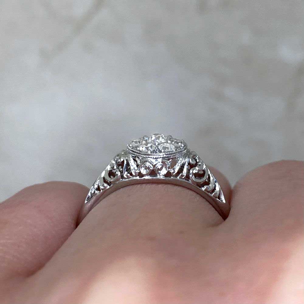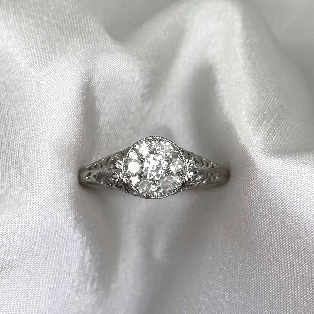 This ring centers an Old European diamond cluster in a shared-prong setting. The diamond cluster is set in a round bezel setting. The diamonds weigh a total weight of 0.35 carats. A detailed openwork filigree decorated the shoulders and under-gallery of this platinum ring.