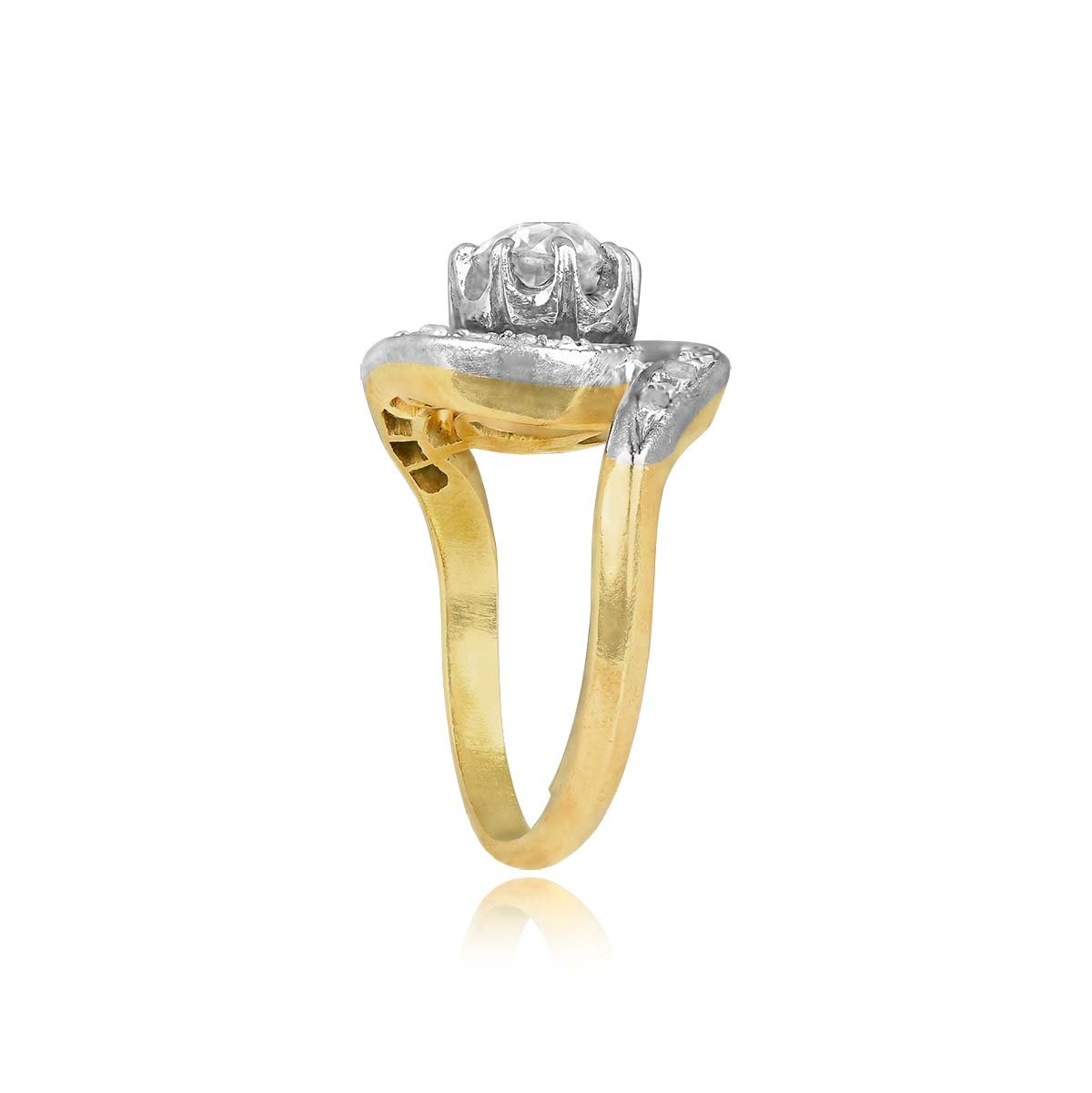 This antique swirl ring features an old European-cut diamond center stone weighing 0.65 carats, H color, and VS1 clarity. Surrounding the center diamond is a ribbon motif pave-set with rose-cut diamonds. The total weight of the additional diamonds is approximately 0.20 carats. This ring was handcrafted in platinum on 18k yellow gold during the Edwardian era, circa 1900. This ring bears French import marks.
