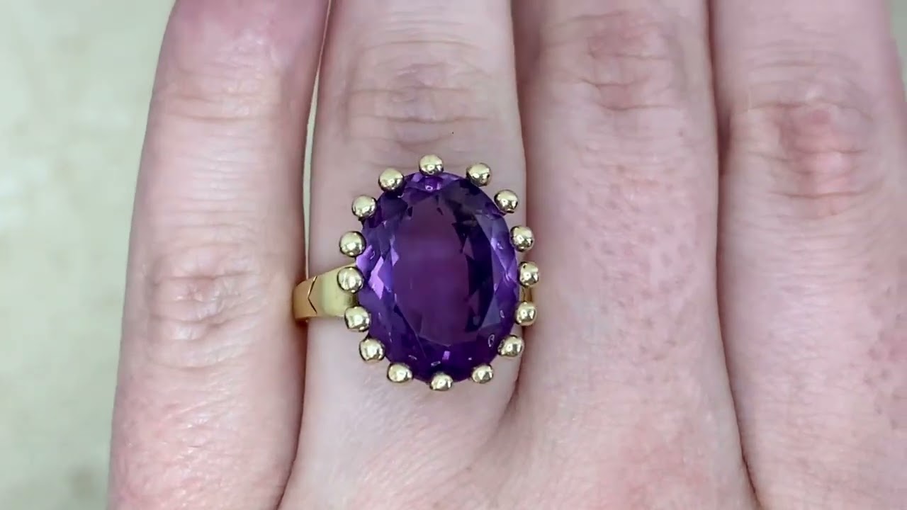 A bold vintage ring featuring an oval-cut amethyst center stone that weighs approximately 7 carats. This ring is mounted in 14k yellow gold. The center is surrounded by a halo of gold bead-shaped prongs. This ring was made in the 1970’s.