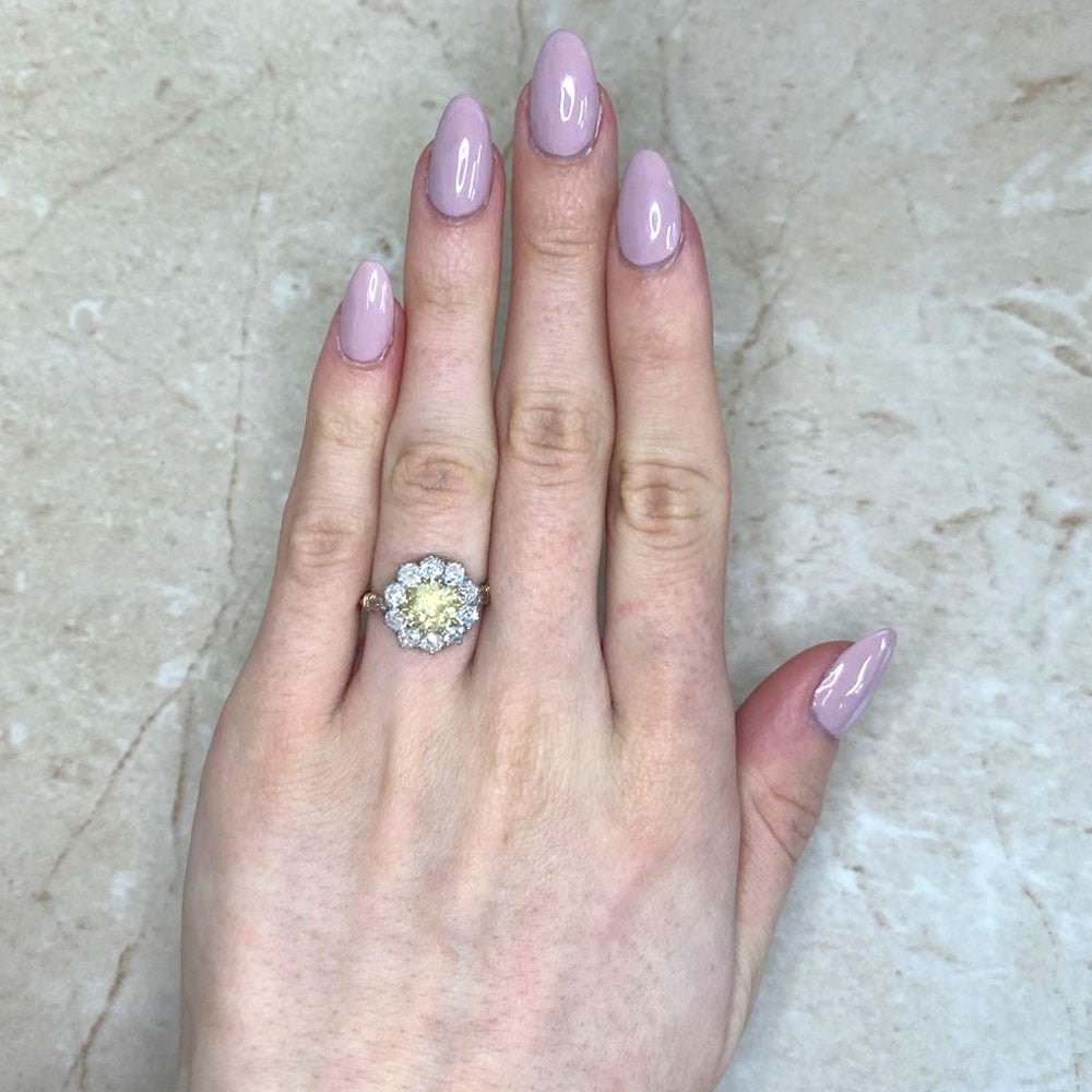 A Word from the Jeweler: The way this yellow diamond radiates a gentle warmth is so captivating, especially when framed by the white old mine-cut diamonds. I love how the contrast between the tones enhances the ring’s brilliance while keeping its elegance.