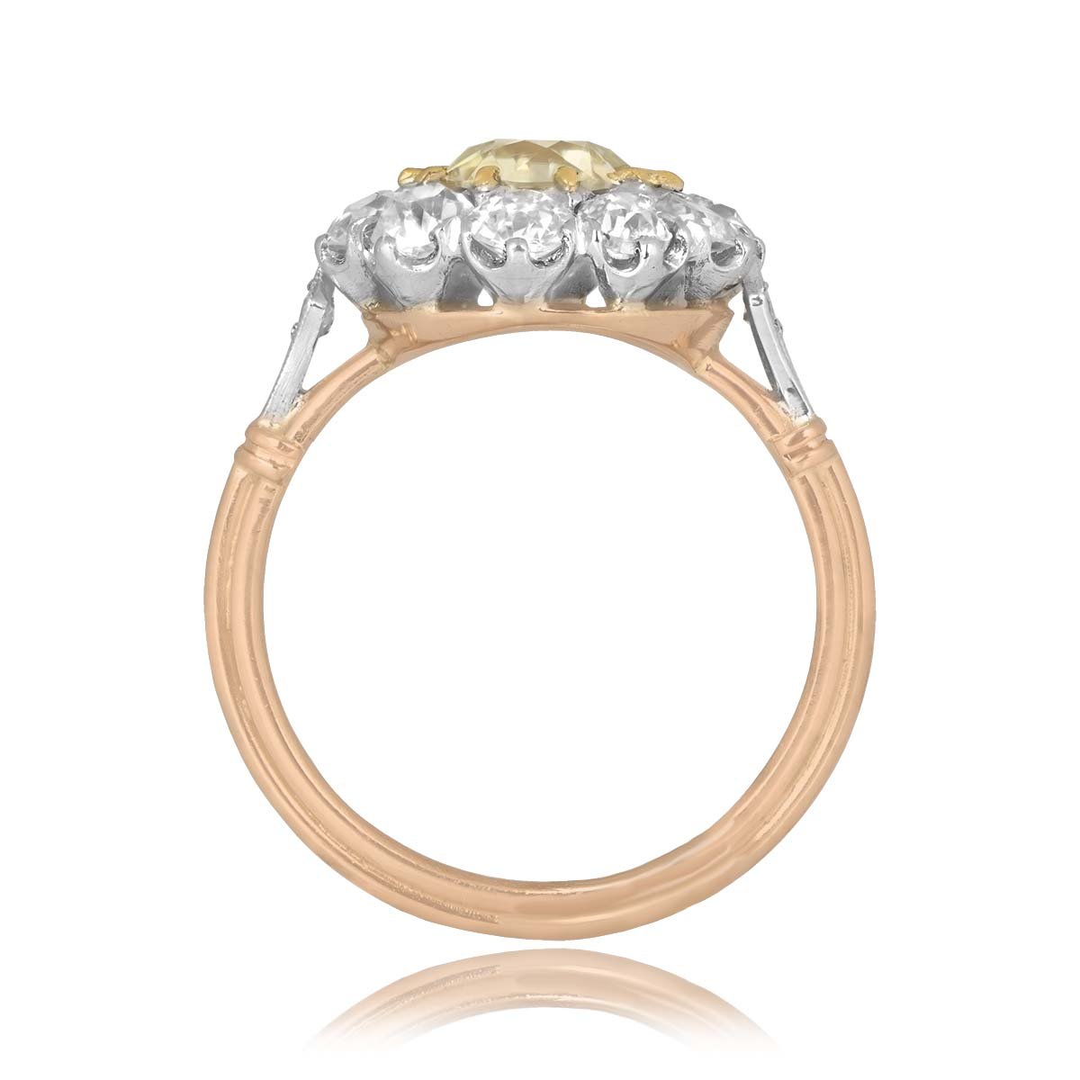 This ring features a center 1.42 carat yellow old European cut diamond with an SI1 clarity. Surrounding the center diamond is a cluster of white old European diamonds. Each shoulder is decorated with an additional diamond and milgrain detailing leading to a triple wire shank. The additional diamonds weigh a total of 1.60 carats. This ring is made in platinum on 18k yellow gold.