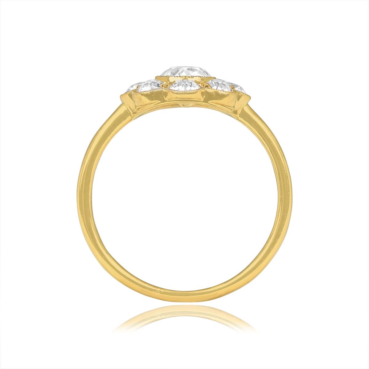 A floral Diamond cluster engagement ring featuring an old European cut diamond weighing 0.67 carats, I color, and VS2 clarity. Surrounding the center stone are additional old European cut diamonds that are set in half-bezels. The total diamond weight of this ring is 1.38 carats. The ring is mounted in 18k yellow gold and is decorated with fine milgrain.