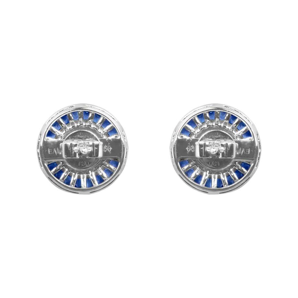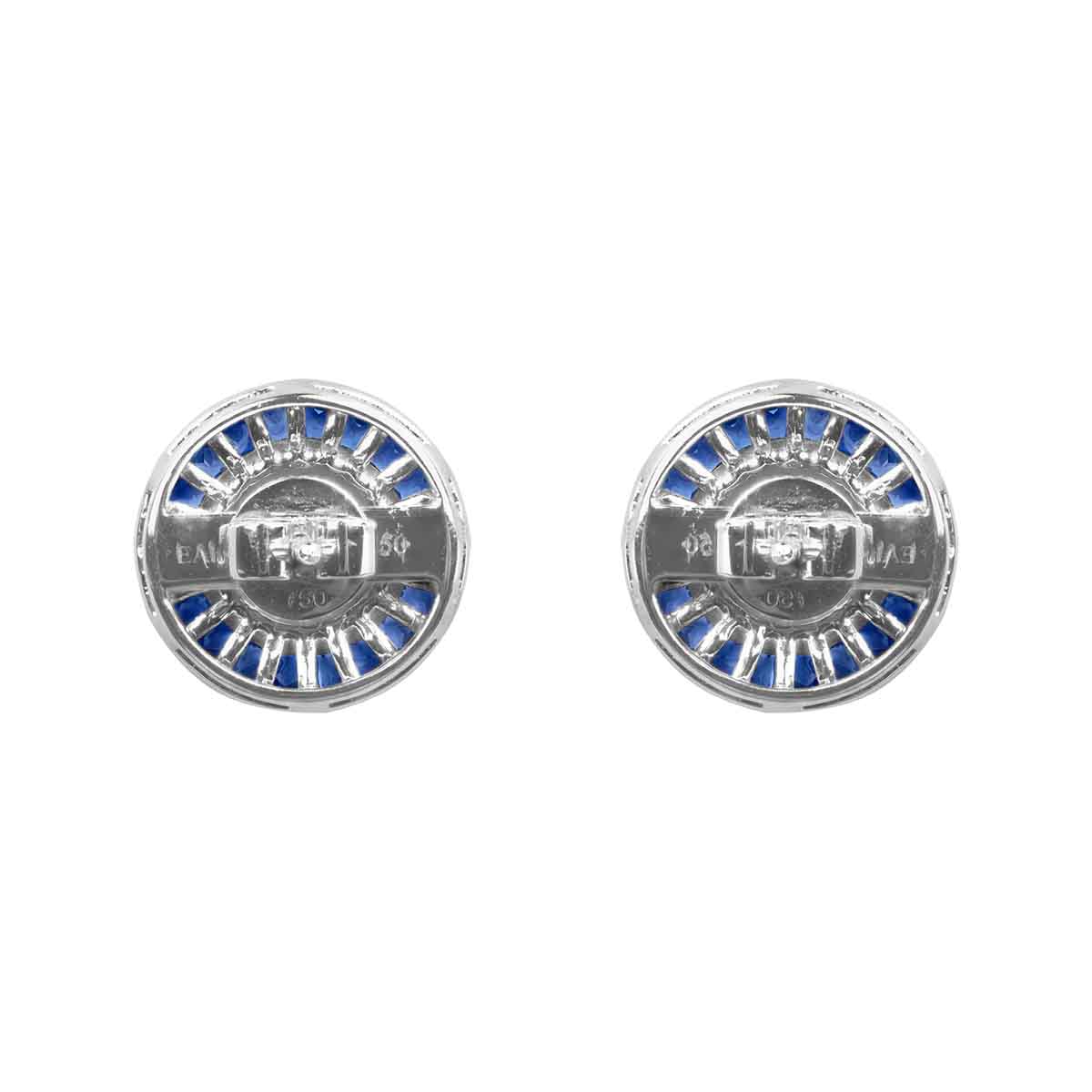 A pair of stud earrings featuring two bezel-set opal center stones weighing a total of 2.97 carats. Surrounding the opal stones are channel-set French cut sapphire halos weighing a total of 1.82 carats. These earrings were made in 18k white gold.