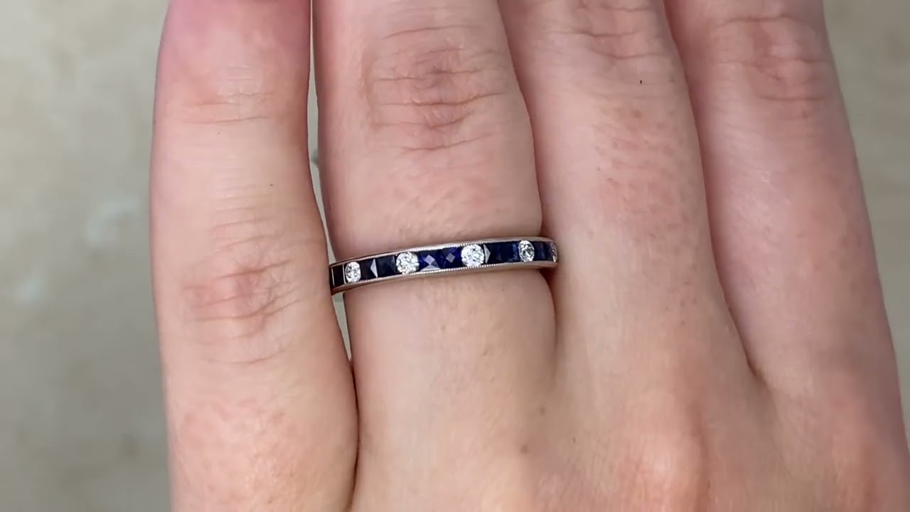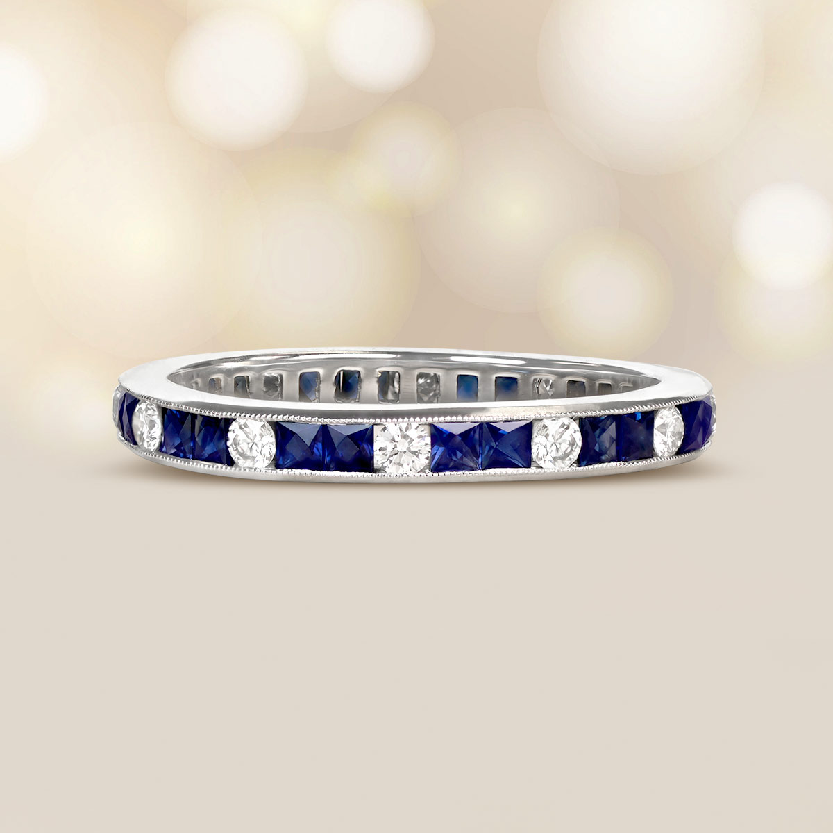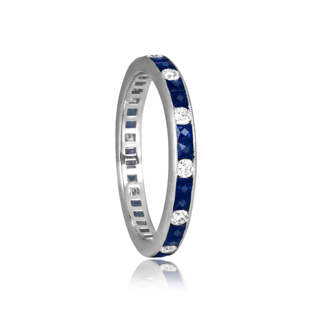 A beautiful eternity wedding band featuring an alternating pattern of two French cut sapphires and a round brilliant cut diamonds. The stones are set in a channel setting with milgrain detailing. This band is made in platinum.