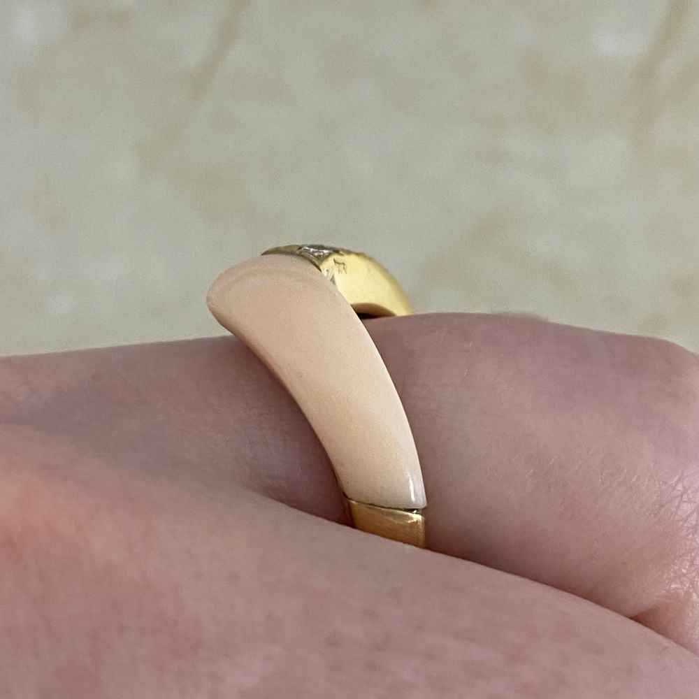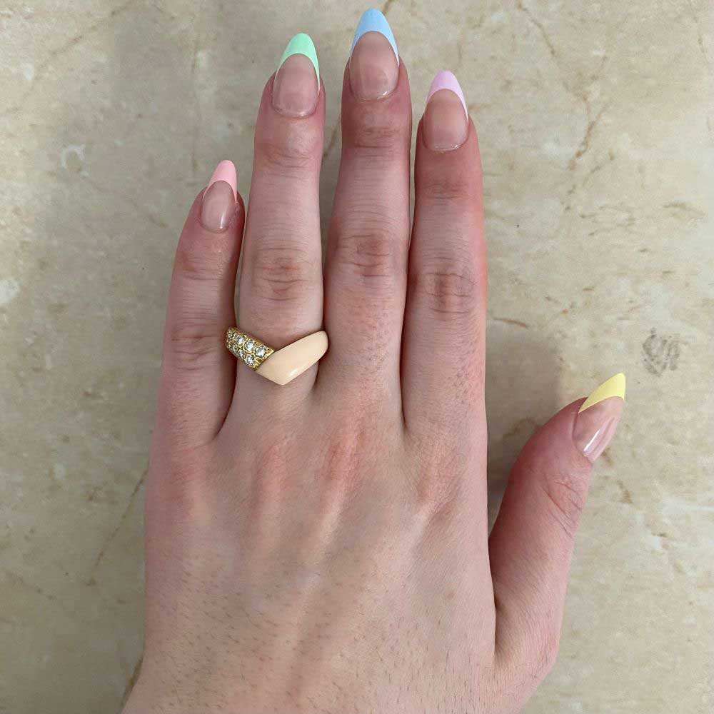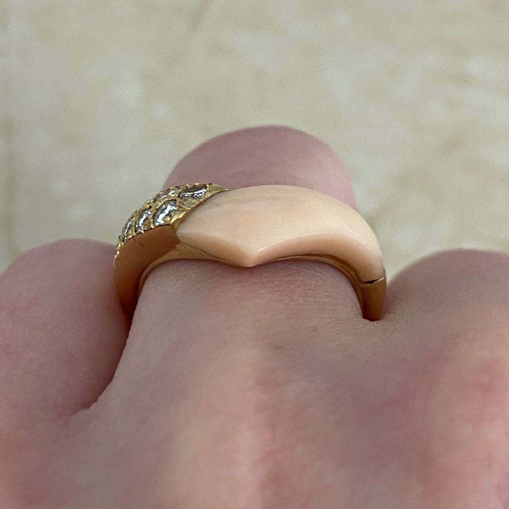 This is a beautiful VCA vintage ring featuring a section of angel skin coral and a section of pave-set round brilliant-cut diamonds mounted in 18k yellow gold. It is a V-shaped and stackable ring. The total weight of the diamonds is approximately 0.52 carats. This ring is signed by Van Cleef and Arpels.