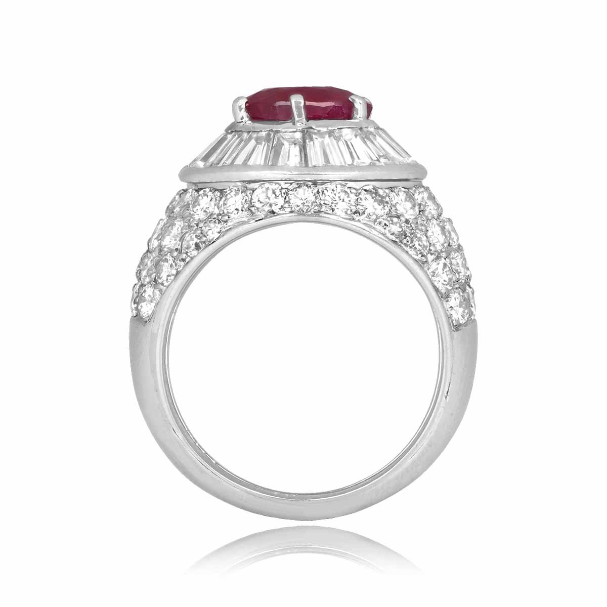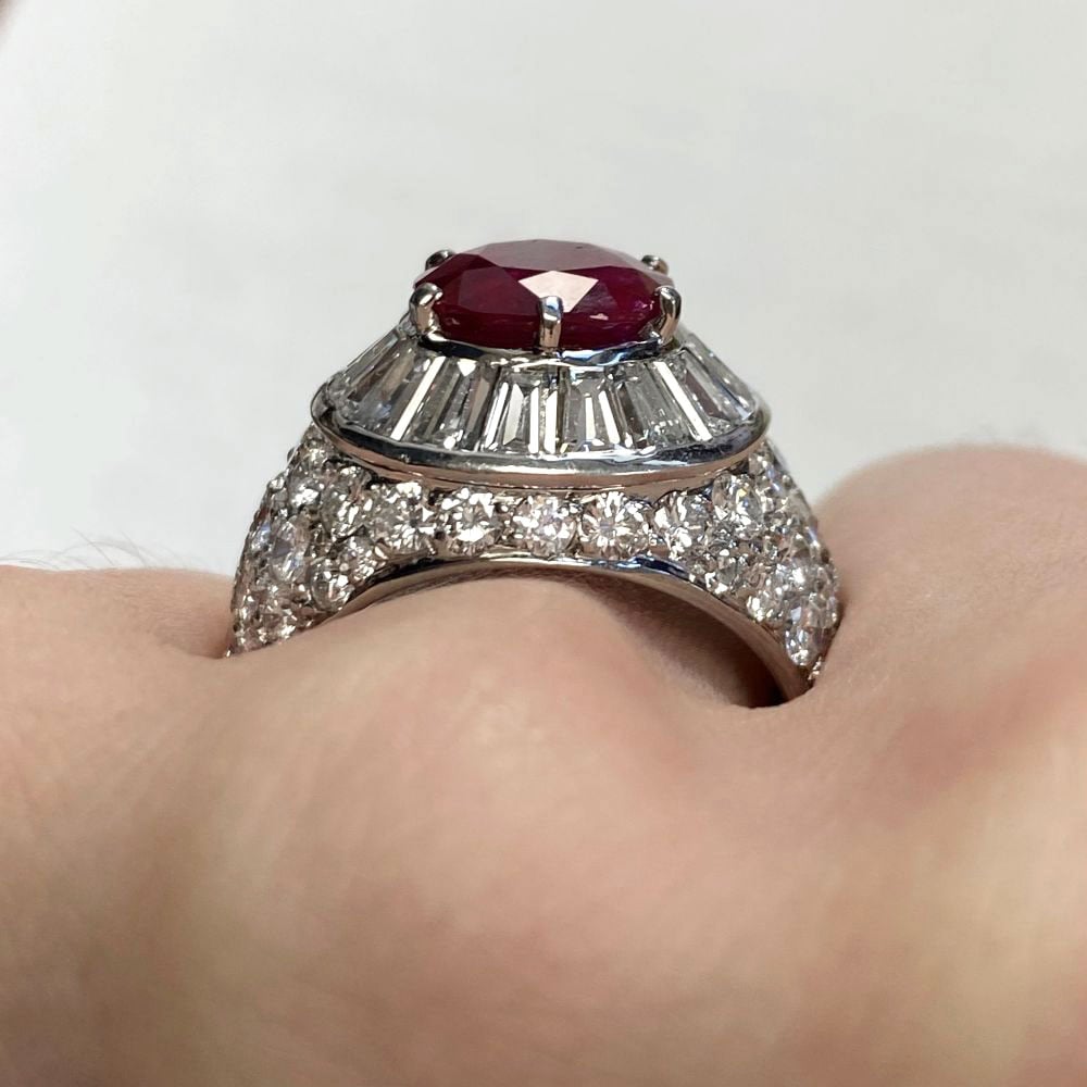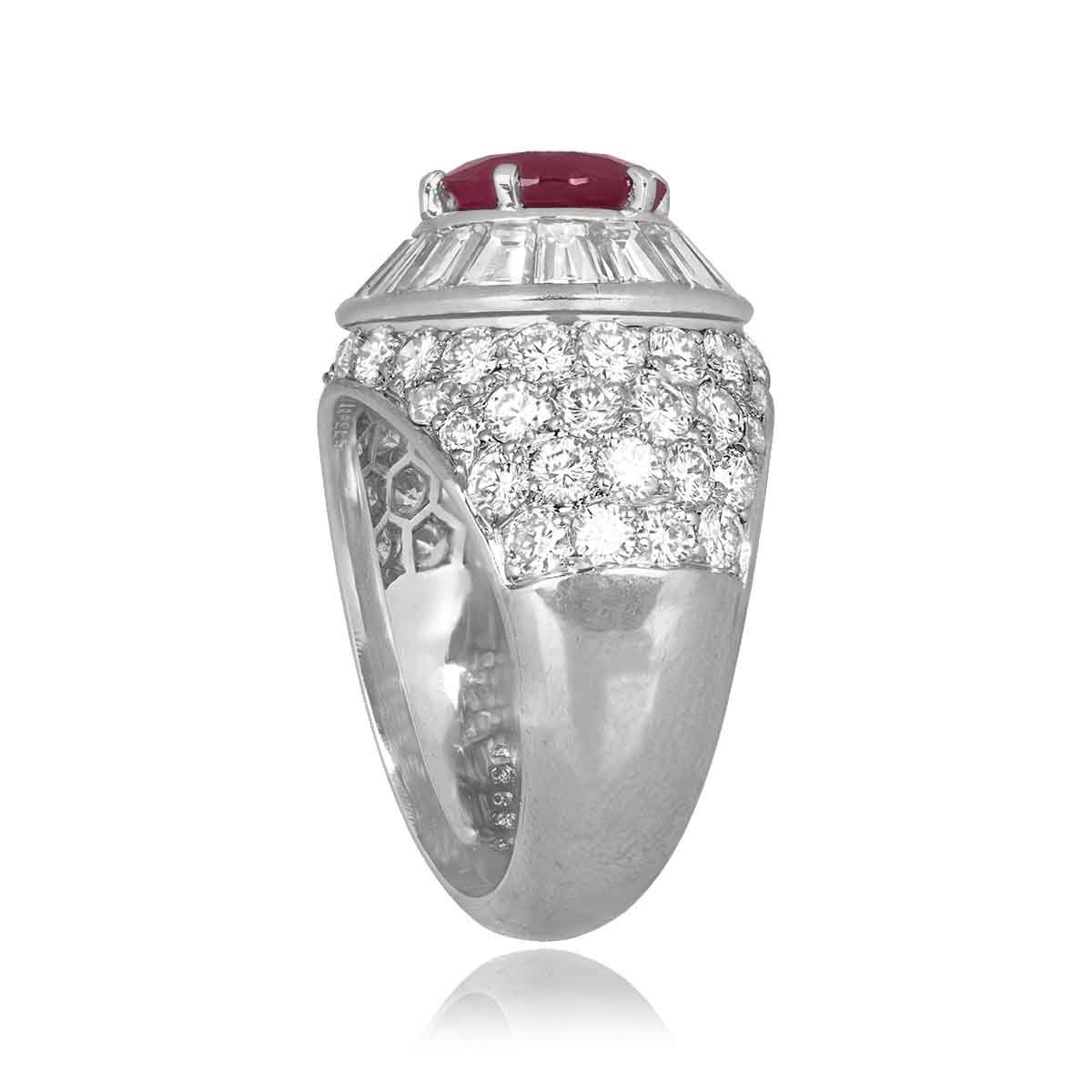 A Beautiful French Van Cleef & Arpels ring centering a 3.12 carat non-heated Burma ruby with an SSEF certificate. Surrounding the center ruby is a domed design of tapered baguette and round diamonds. This ring was made in platinum and signed VCA.