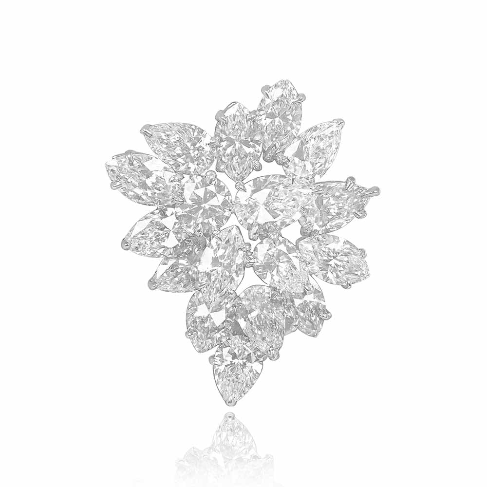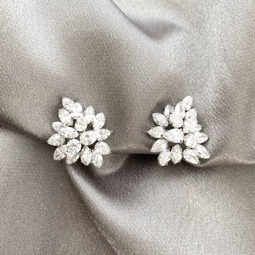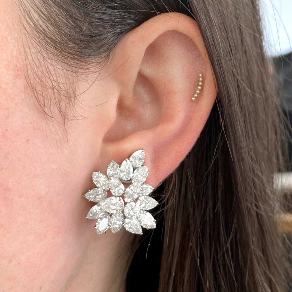 A beautiful pear of diamond cluster earrings featuring pear-shaped and marquis-shaped diamonds that are prong-set in platinum. The total approximate diamond weight of these earrings is 13.65 carats, G color and VVS clarity overall.