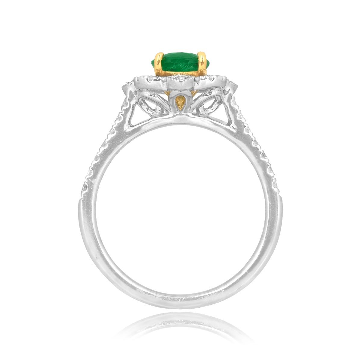 This ring centers a 1.00 carat oval-cut emerald stone set in a prong setting. Surrounding the emerald is an openwork design featuring diamonds and milgrain detailing. Additional diamonds decorate the shoulders of this ring. The diamonds weigh a total of 0.25 carats. This ring is made in platinum and 18k yellow gold.