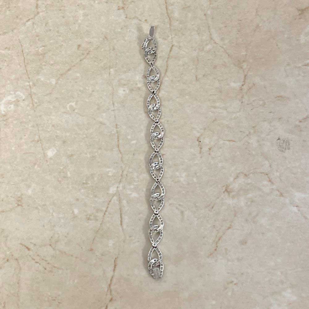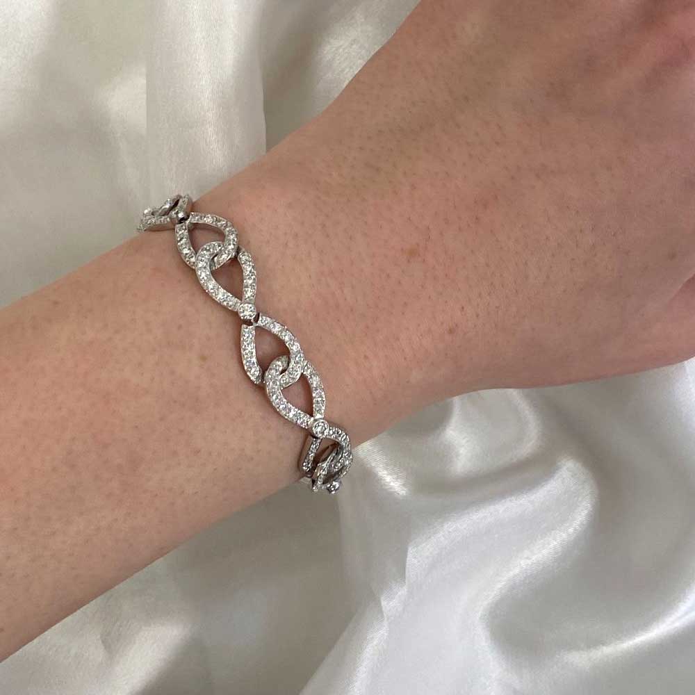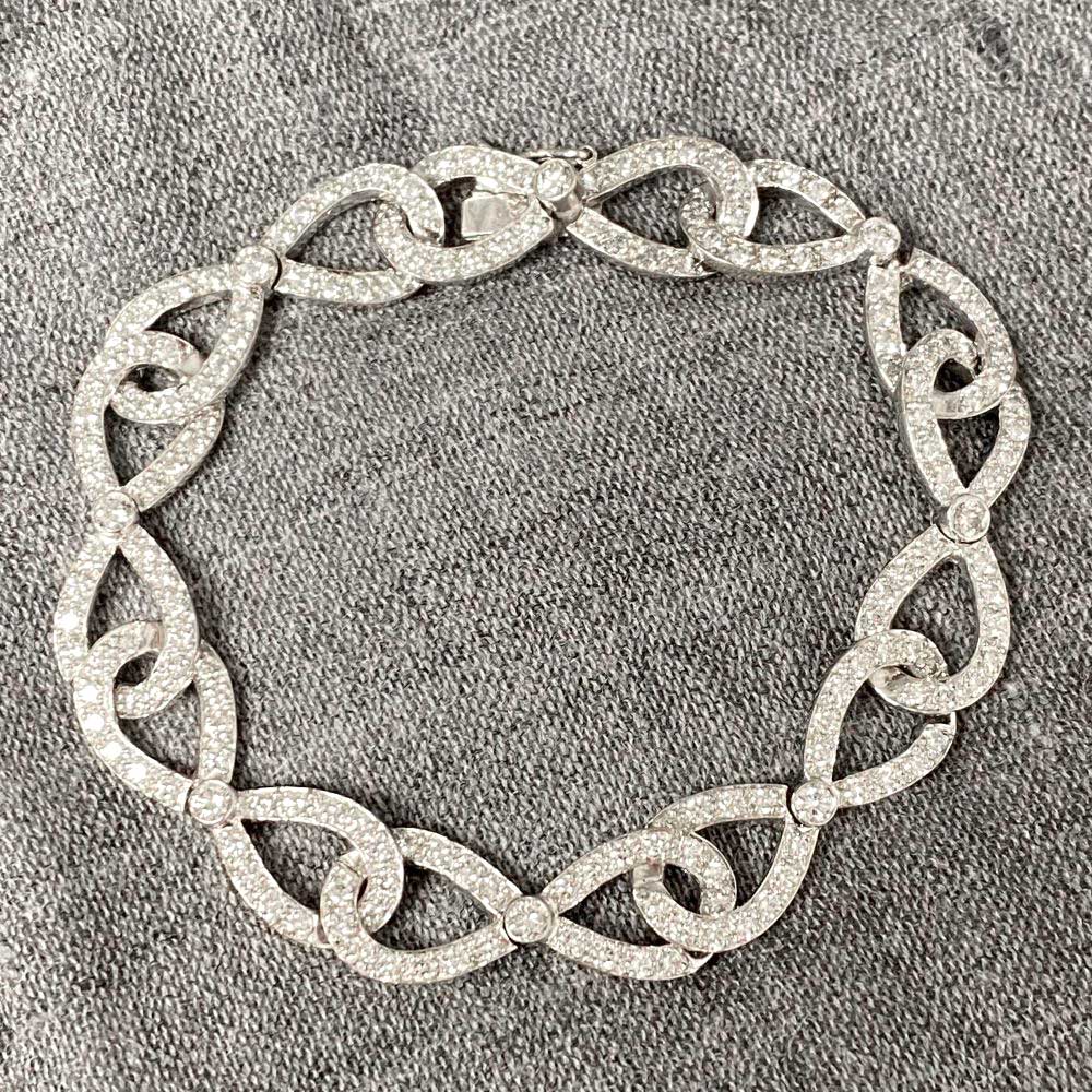 A stunning Tiffany platinum bracelet featuring bow-motif links studded in round brilliant cut diamonds. The diamonds in the link are pave set, and the diamonds in the center bow are bezel set. This bracelet is signed by Tiffany and Co and Platinum.