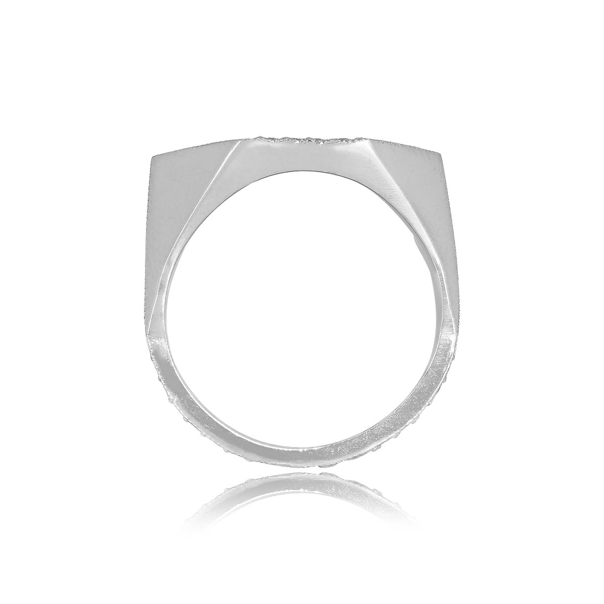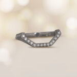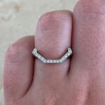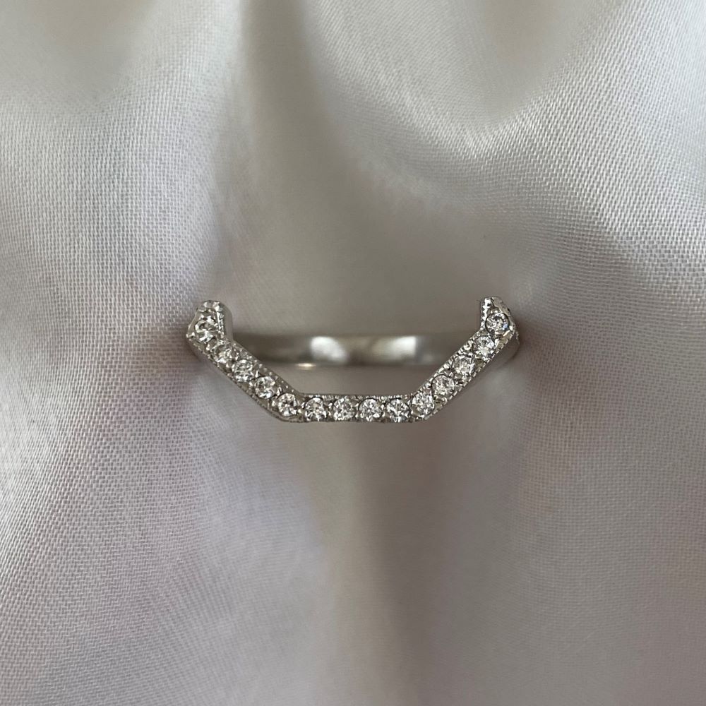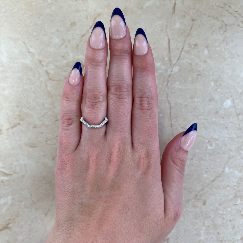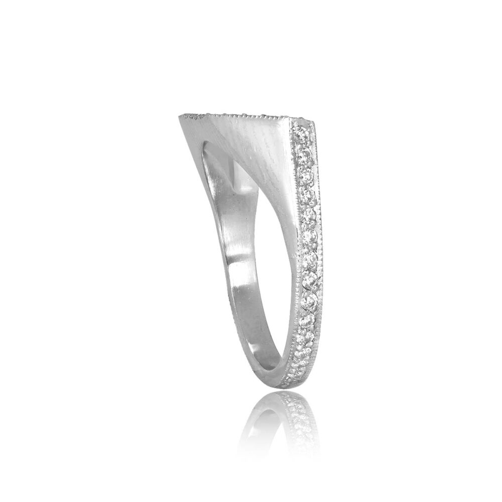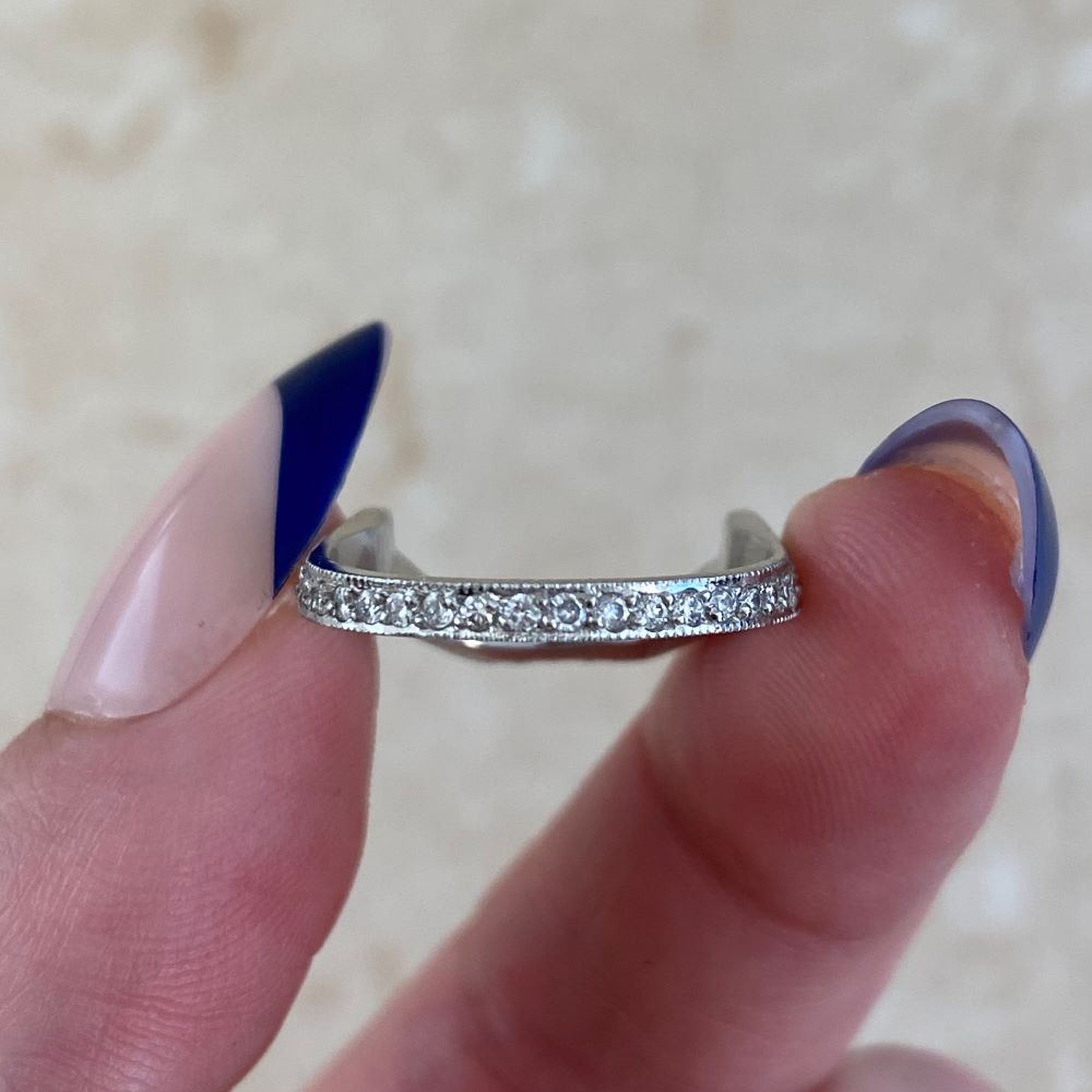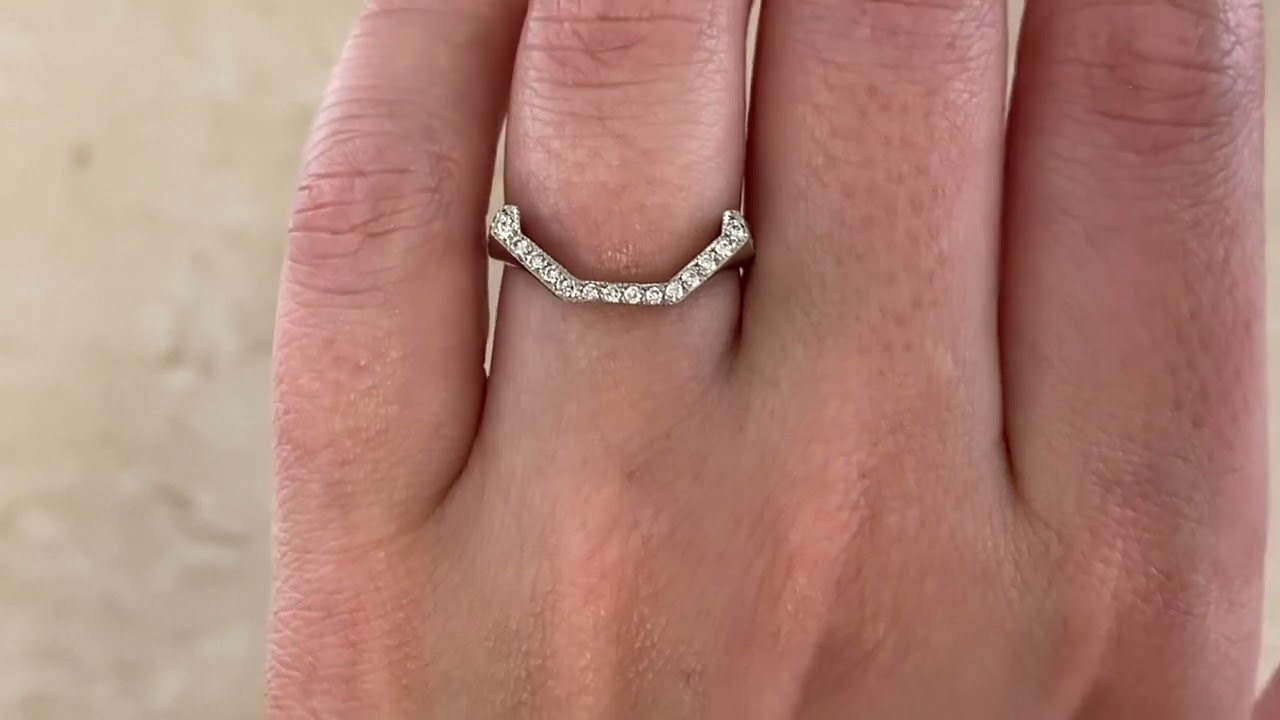 A beautiful eternity band showcasing a unique soft chevron shape making it ideal for pairing with a ring featuring a prominent geometric center stone. This band is decorated with pave-set diamonds weighing approximately 0.66 carats total and is made in platinum.