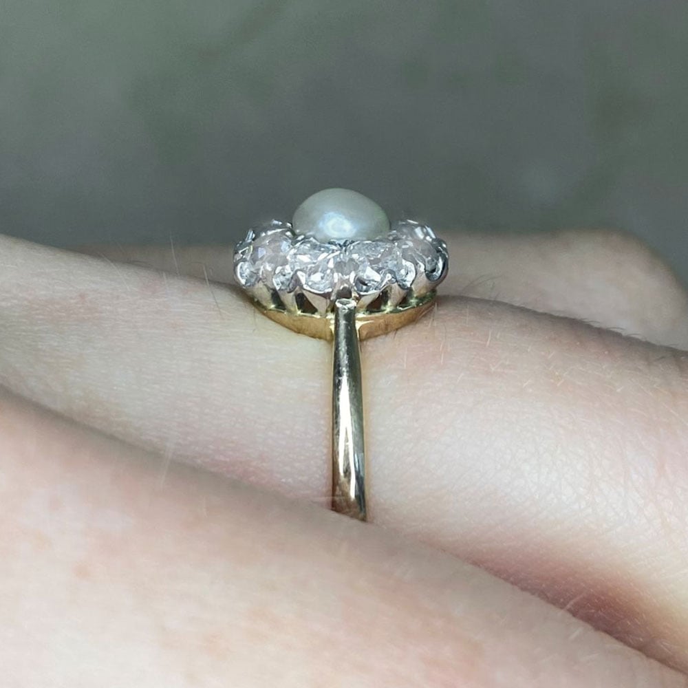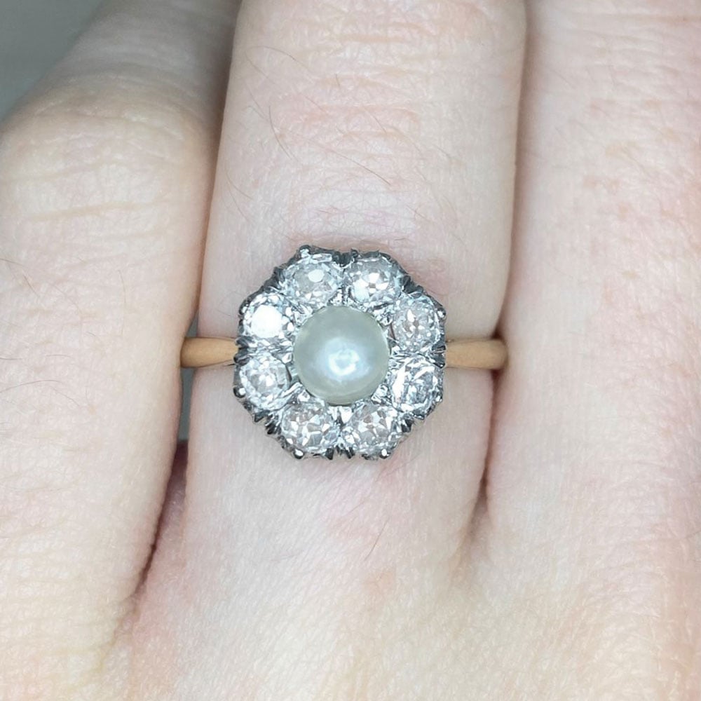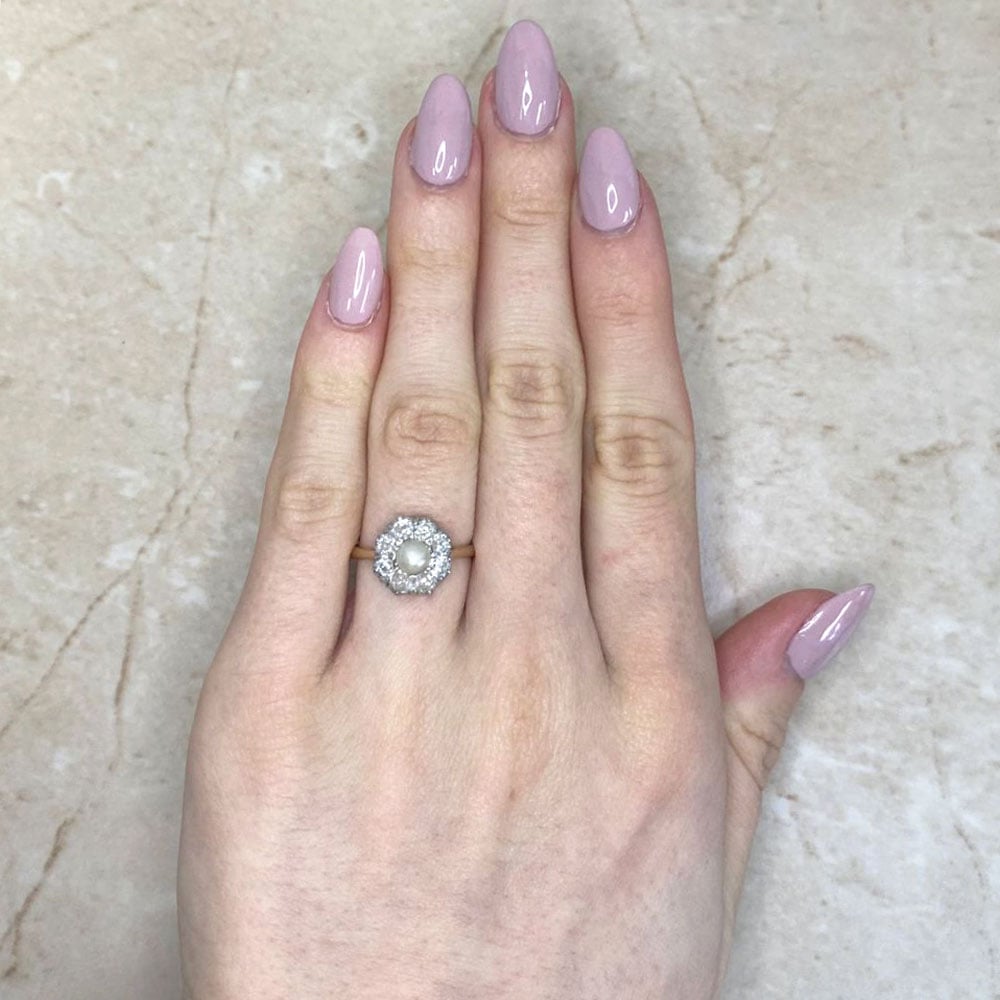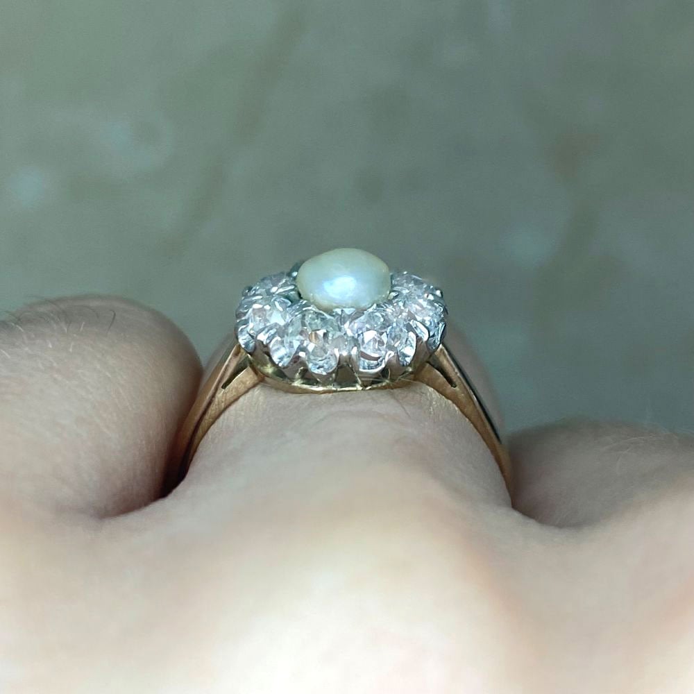 A Word from the Jeweler: I love how this Edwardian ring blends the luster of the pearl with the diamond cluster creating an elegant balance of texture and light. It pairs beautifully with other antique jewelry or adds a refined touch when worn alongside modern gold accents.
