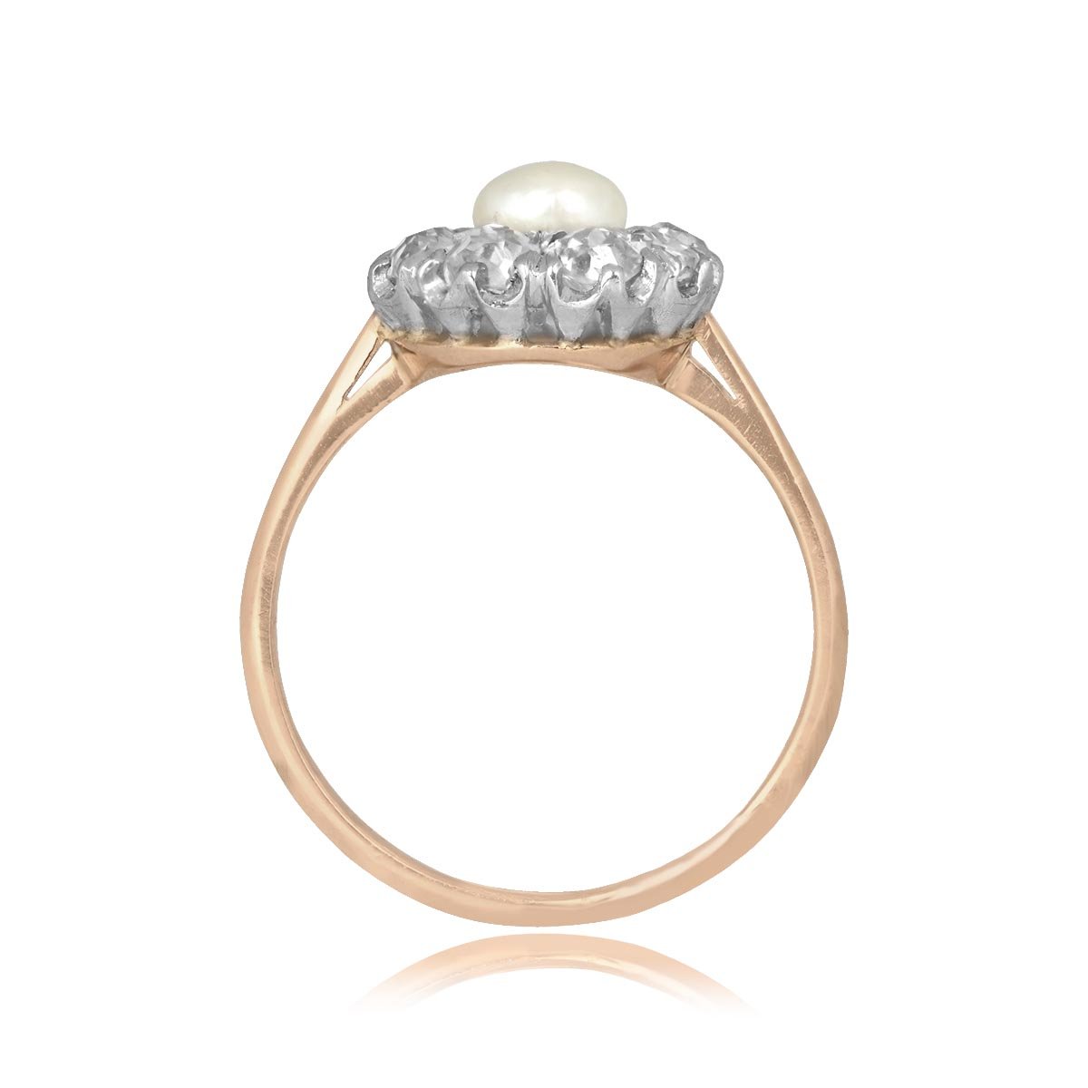 An Edwardian era ring centering a natural saltwater pearl. Surrounding the pearl is a cluster of old European cut diamonds. The diamonds weigh a total of 1.15 carats. This ring was made in platinum on 18k yellow gold, circa 1910.