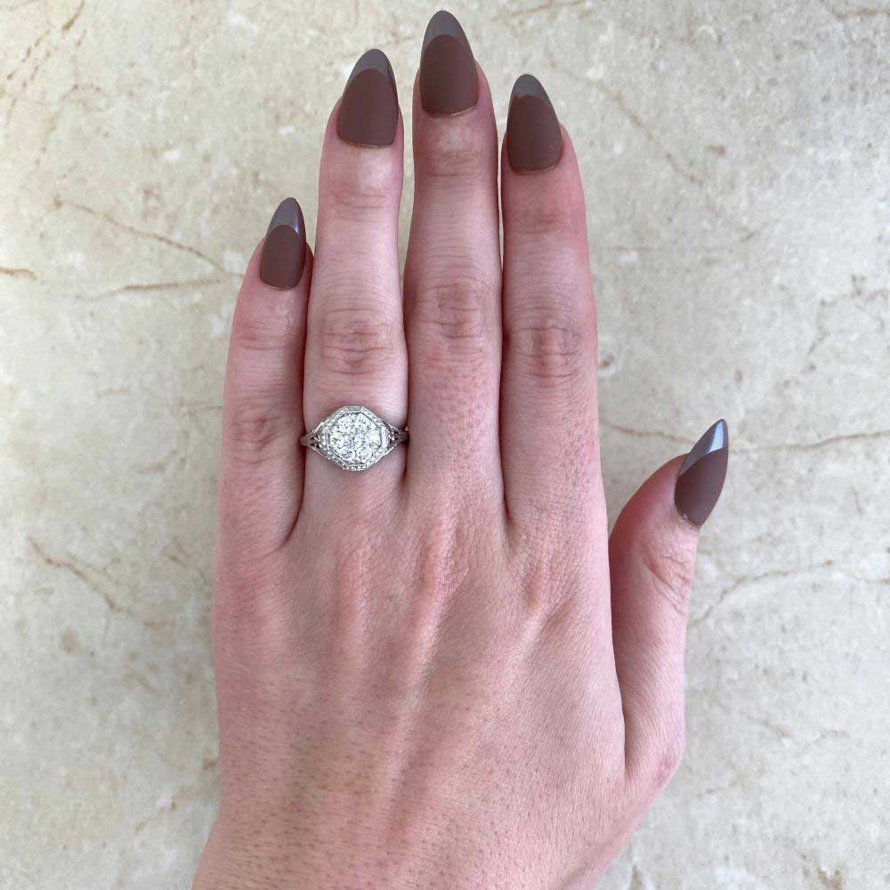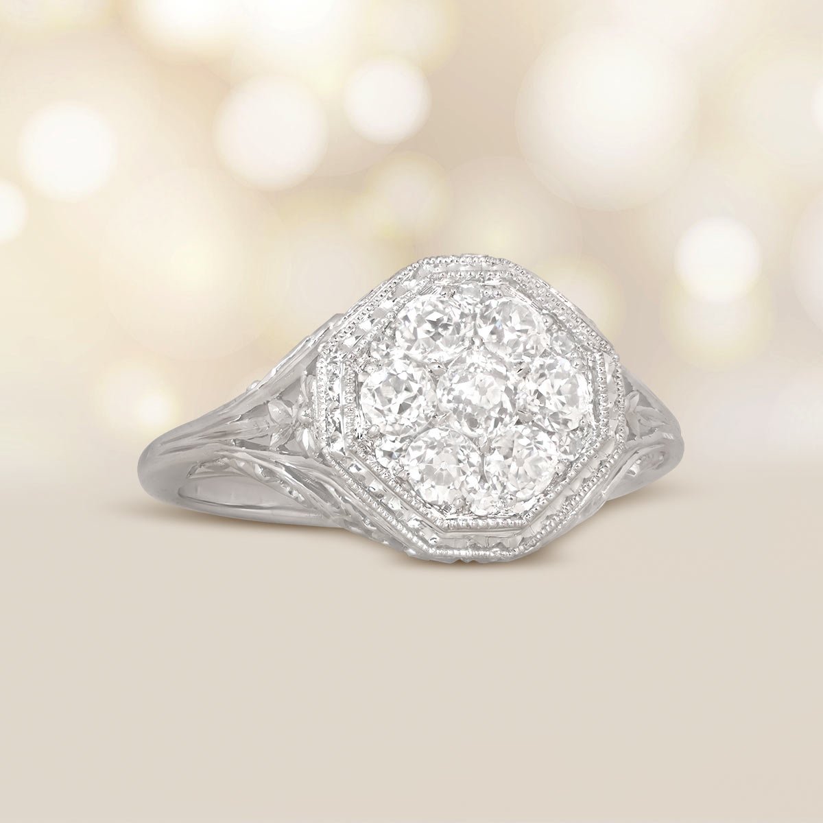 A Word from the Jeweler: I love how the engraved scroll and floral filigree bring depth to the design without taking attention away from the cluster center. It’s rare to find this level of metalwork on a ring that still feels balanced and refined.