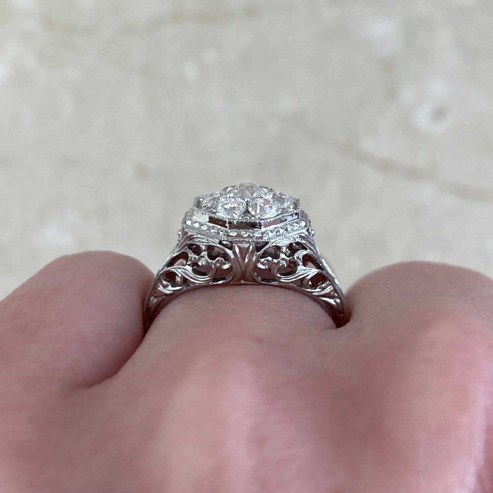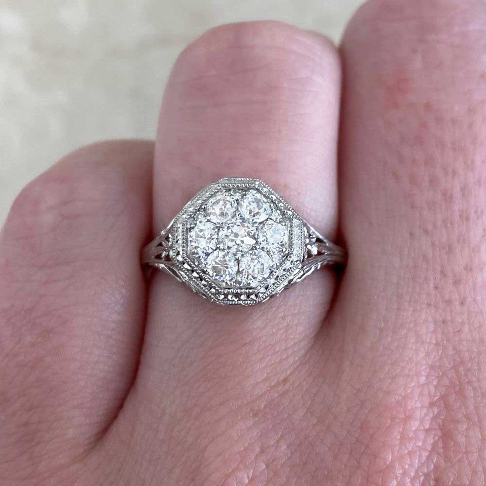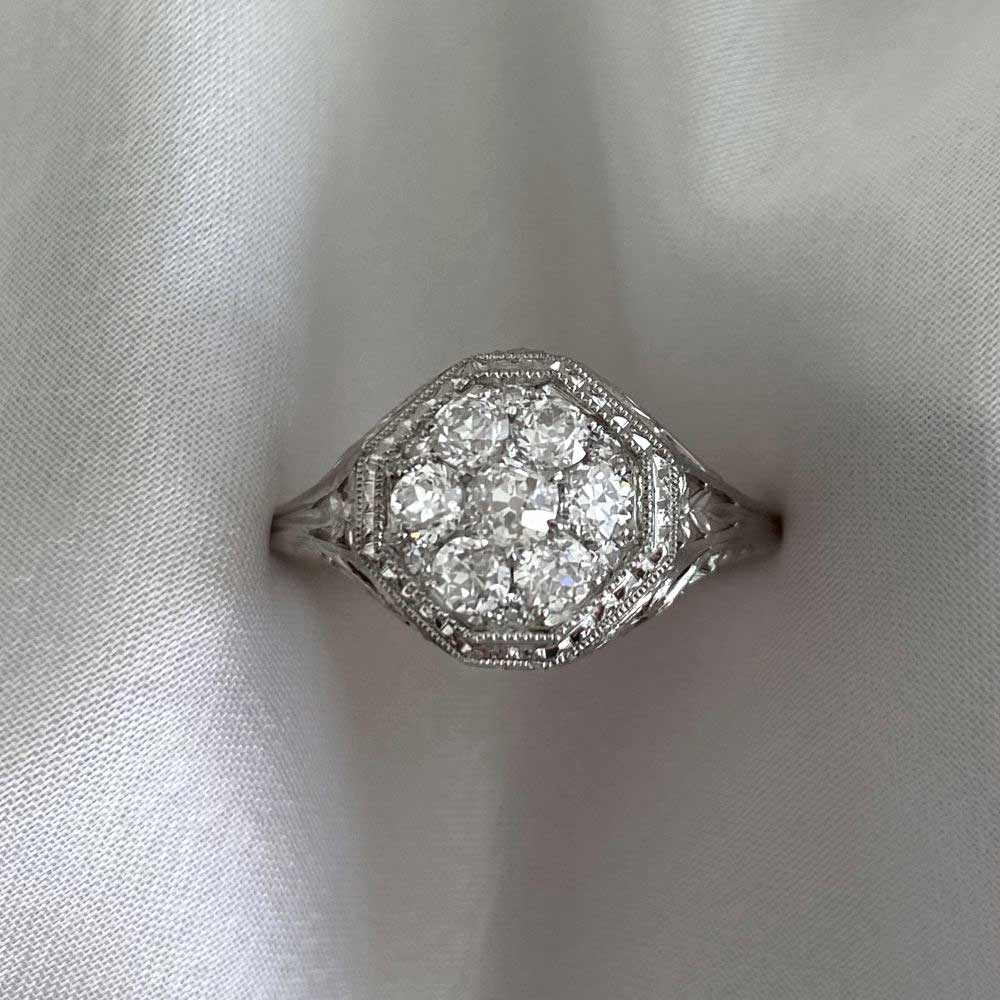 This ring features a center old European cut diamond cluster weighing a total of 0.69 carats with a J color and VS2-SI1 clarity overall. The center cluster is prong set in an octagonal bezel setting with engravings and fine milgrain detail. The under-gallery and shoulders of the ring are decorated with an open floral and scroll work design. This ring is made in platinum.