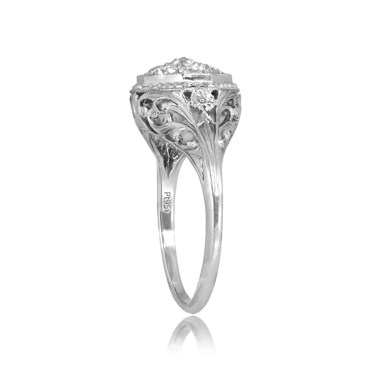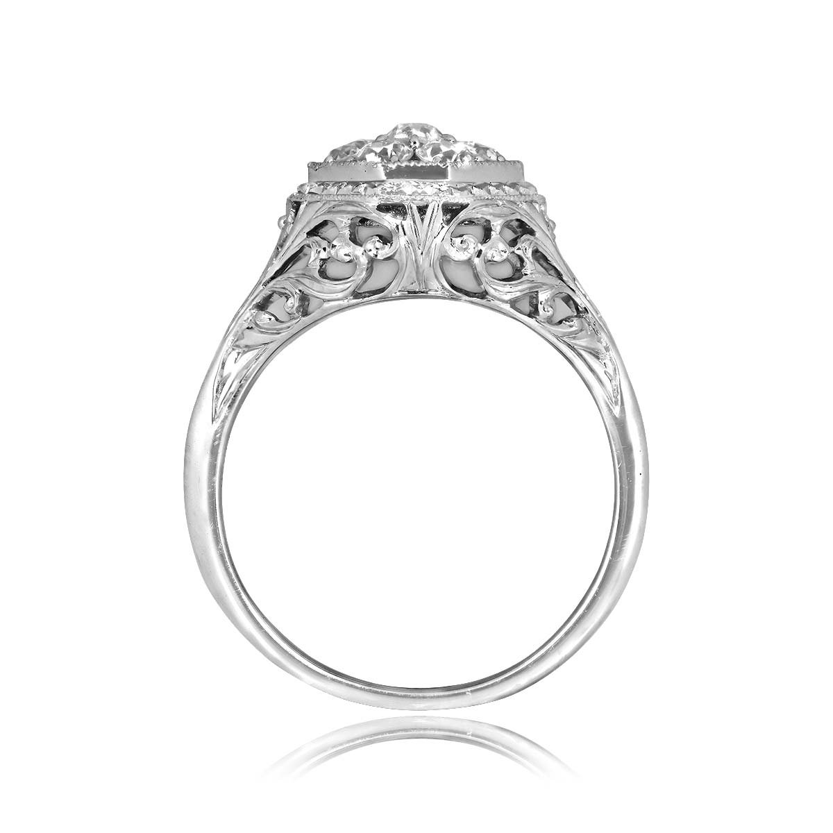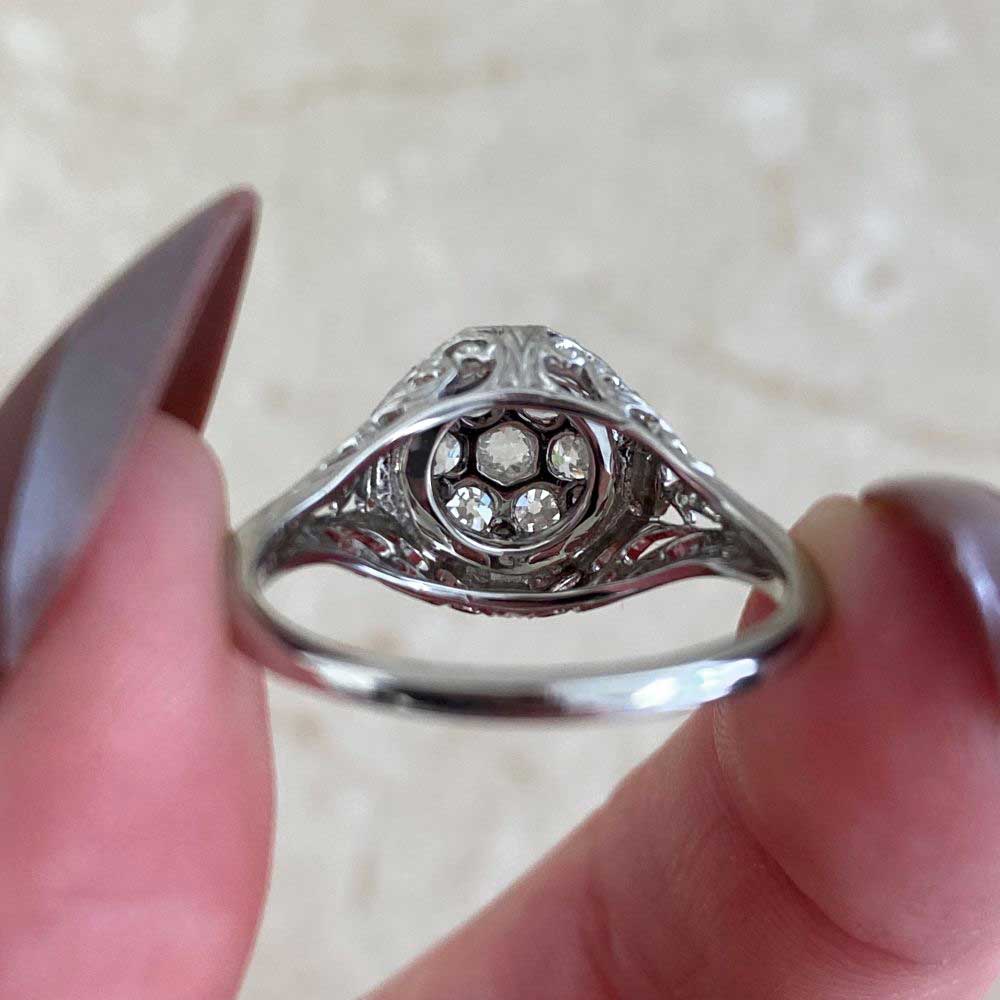This ring features a center old European cut diamond cluster weighing a total of 0.69 carats with a J color and VS2-SI1 clarity overall. The center cluster is prong set in an octagonal bezel setting with engravings and fine milgrain detail. The under-gallery and shoulders of the ring are decorated with an open floral and scroll work design. This ring is made in platinum.