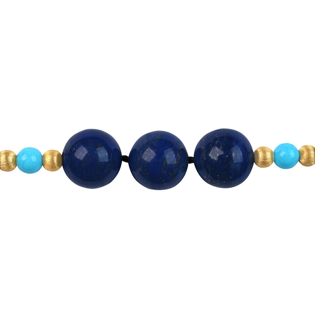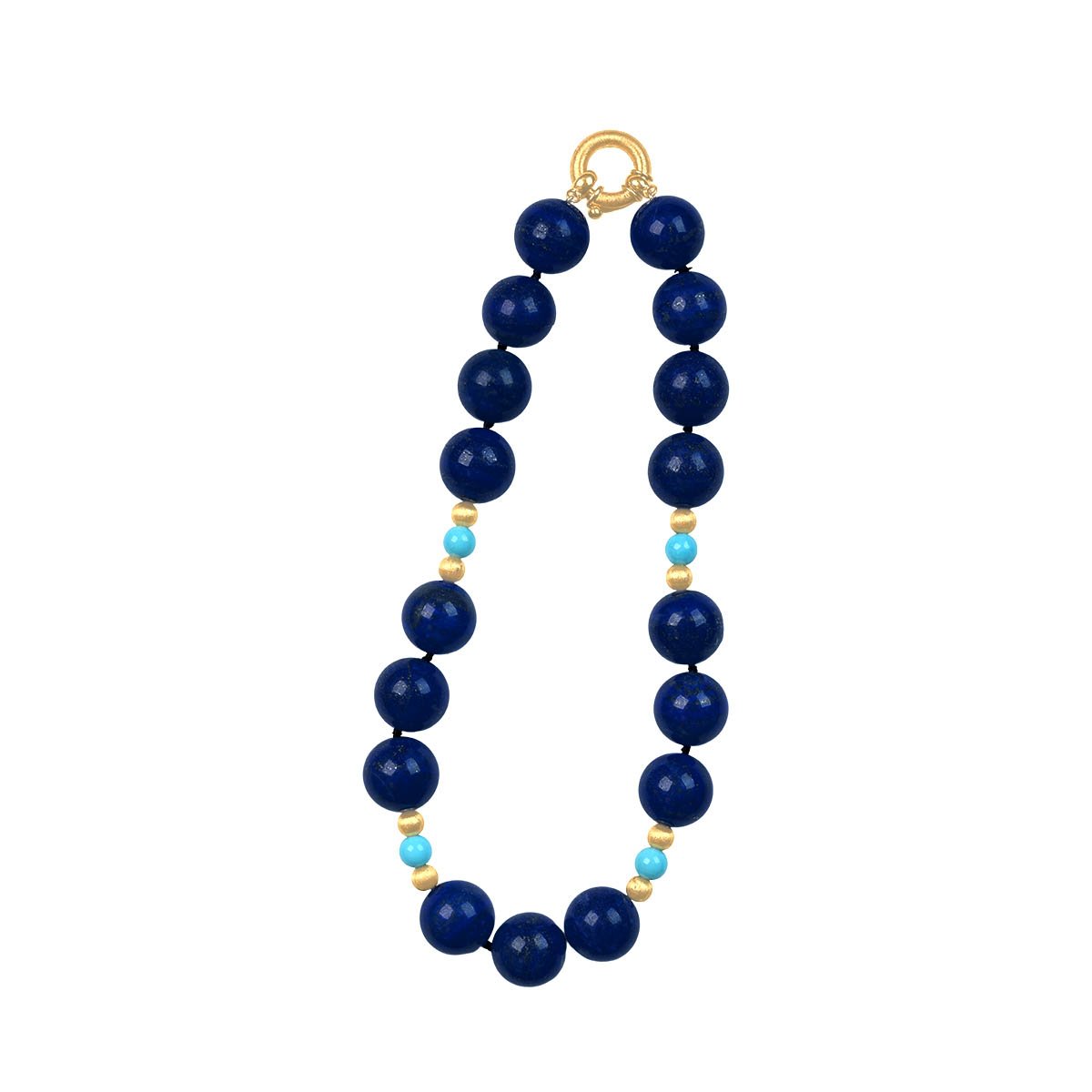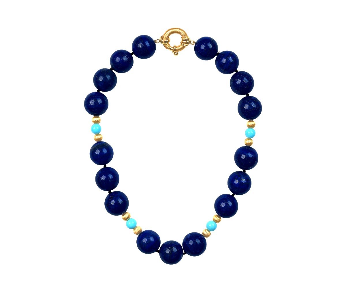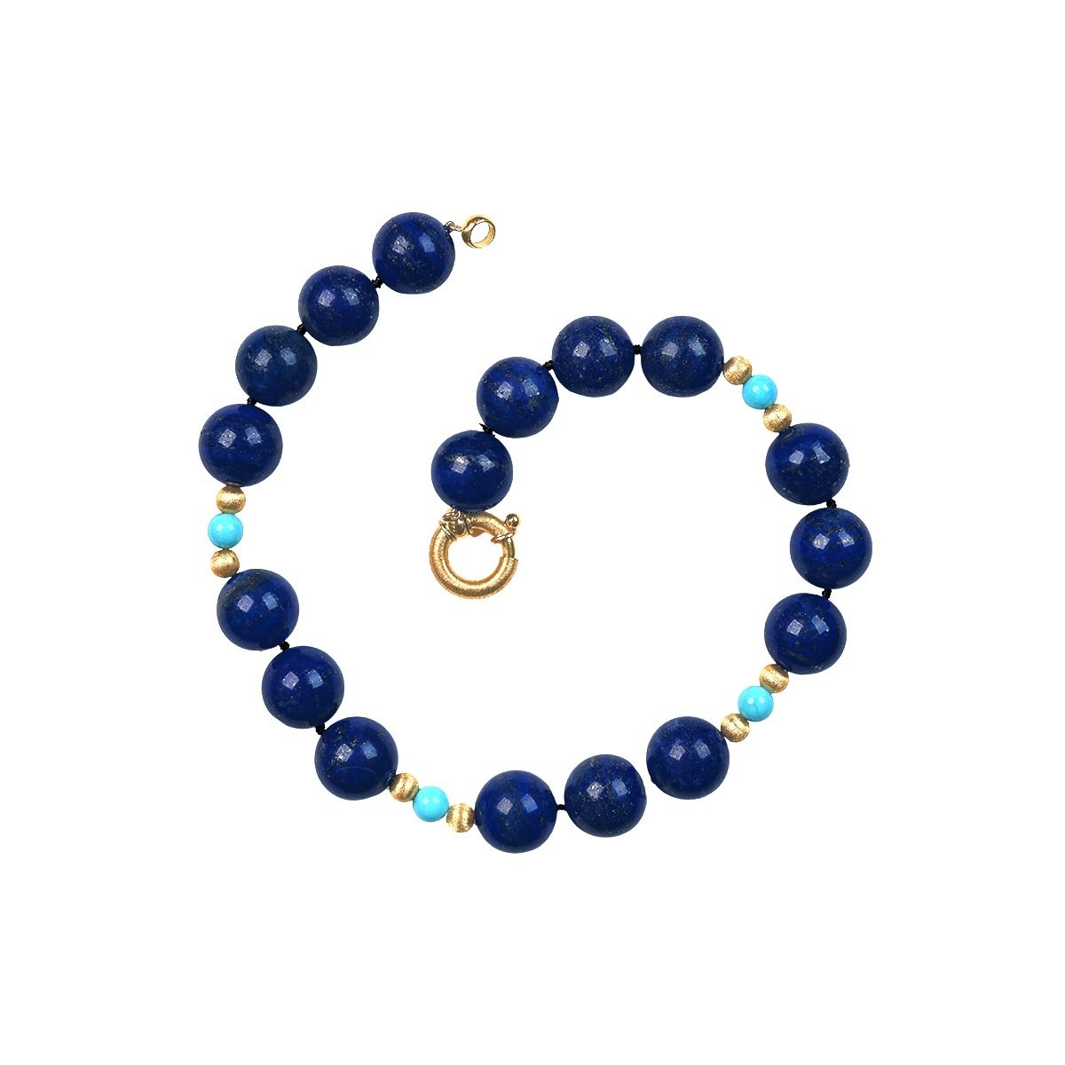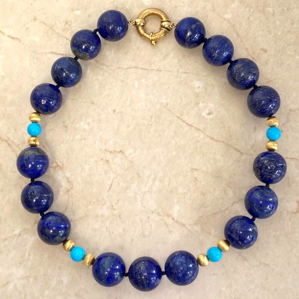 A beautiful vintage necklace featuring lapis, turquoise and textured yellow gold beads. This necklace showcases an alternating beaded pattern with an 18k yellow gold spring ring clasp, handcrafted circa 1970.