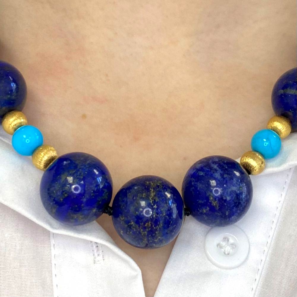 A Word from the Jeweler: I love how the deep blue beads are paired with the turquoise and gold accents, giving this vintage necklace a bold and timeless character. The contrast of colors creates a striking look that feels both vibrant and elegant.