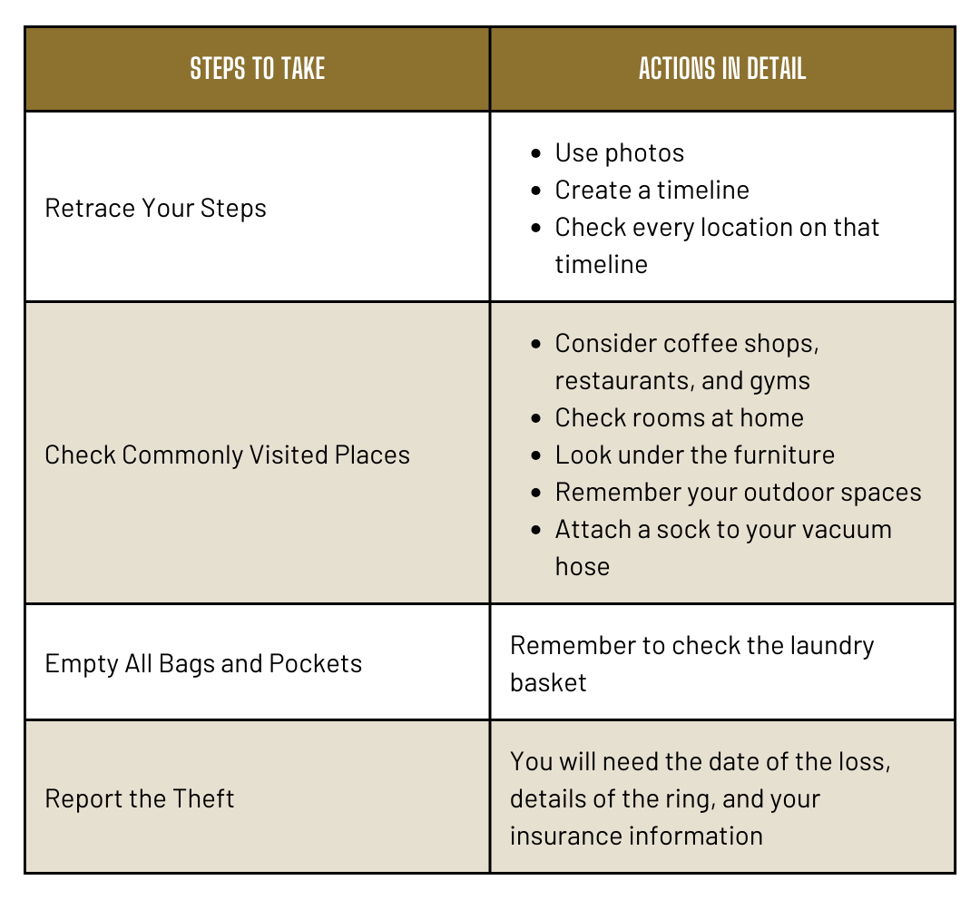 There aren’t many things more heart-stuttering than realizing you’ve lost a piece of jewelry. Rings, in particular, can hold immense sentimental significance. Losing one is simply awful, and the thought that someone could have stolen it can be devastating. But what should you do?